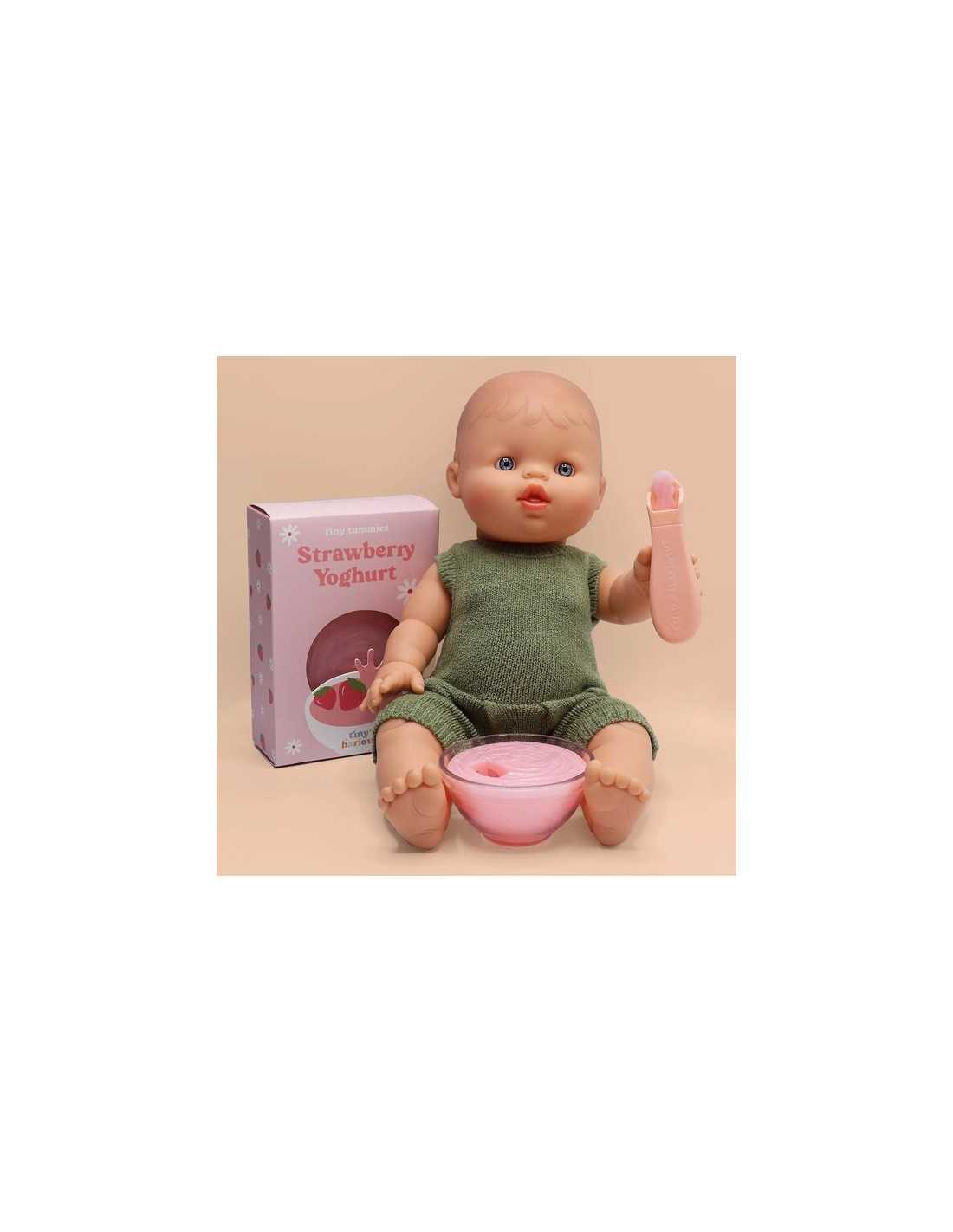 C'est l'heure du goûter! Au menu aujourd'hui : délicieuse yaourt à la fraise. Le bol magique Tiny Tummies est livré avec une cuillère spéciale dotée d'un mécanisme rétractable, créant l'illusion que la poupée mange réellement la nourriture.