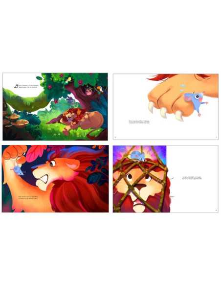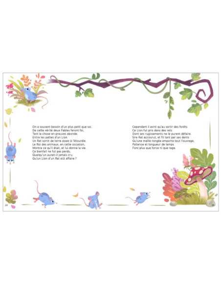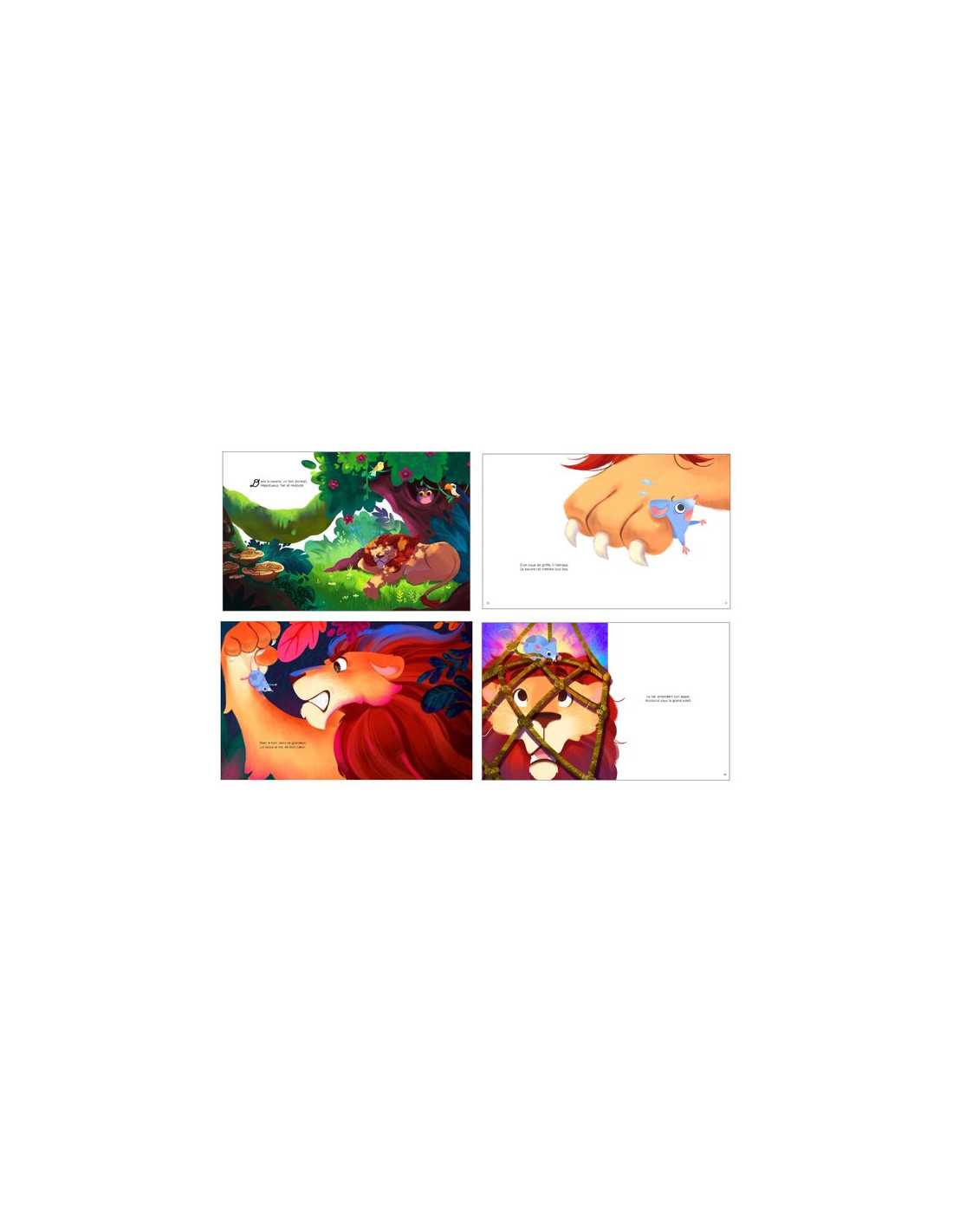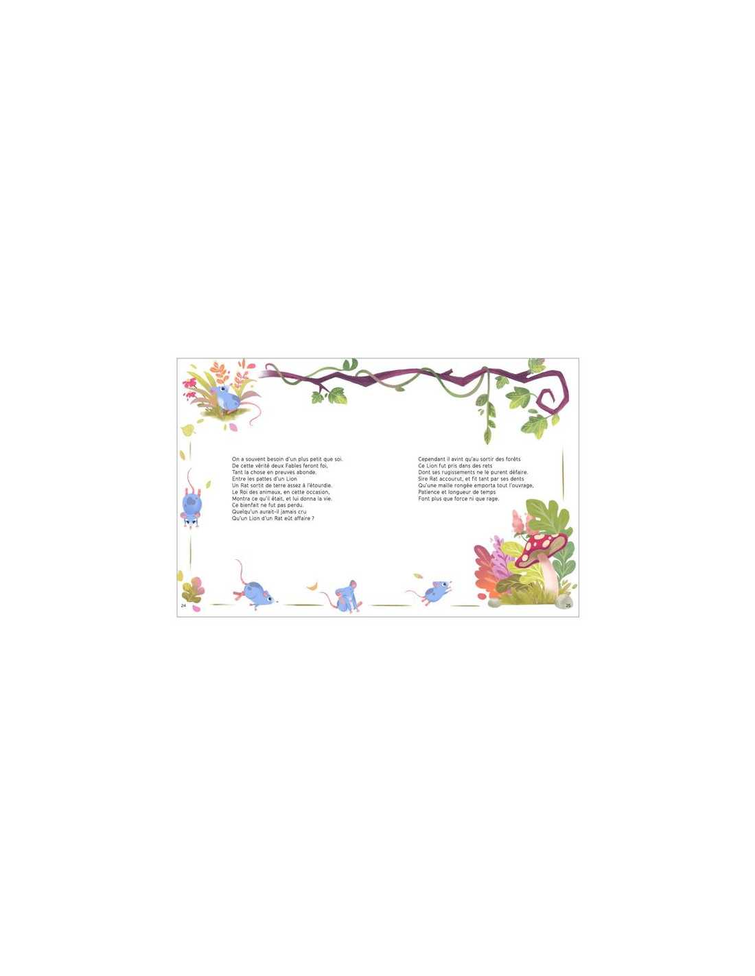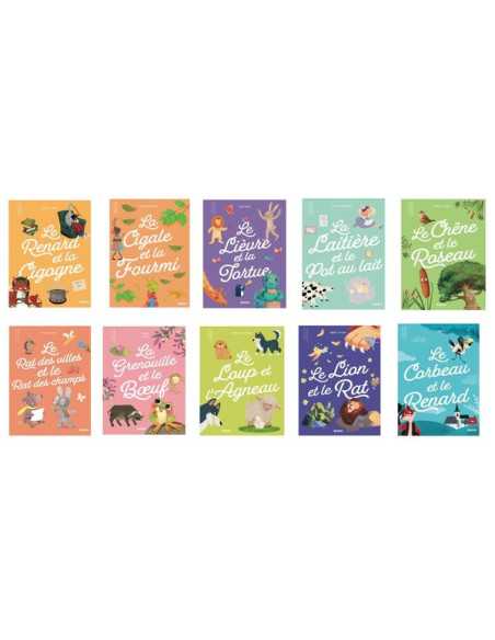 L’étui cartonné, tout en dorure, propose 10 livres reliés en couverture souple avec 10 fables : La Cigale et la fourmi, Le chêne et le roseau, Le corbeau et le renard, La grenouille et le boeuf, La laitière et le pot au lait, Le lion et le rat, Le loup et l’agneau, Le rat des villes et le rat des champs, Le renard et la cigogne et Le lièvre et la tortue.