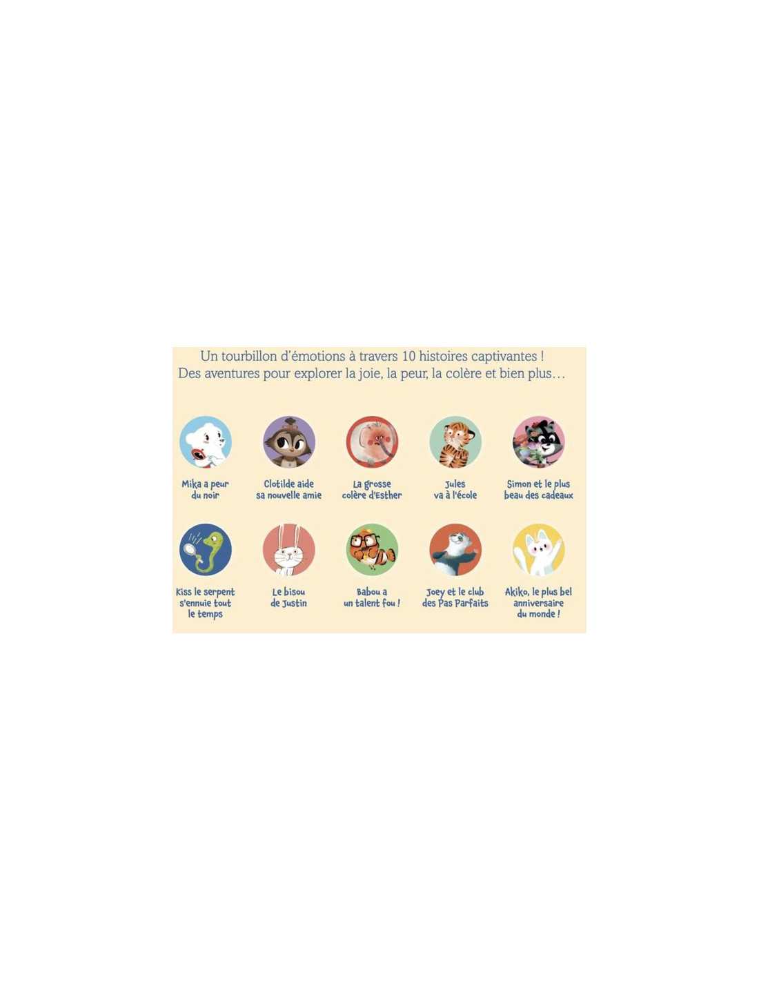 Un recueil qui réunit 10 héros de la collection pour accompagner l'enfant à travers les différentes émotions qu'il peut ressentir : La grosse colère d'Esther (La colère), Simon et le plus beau des cadeaux (la surprise), Clotilde vient en aide à son amie (La tristesse, la confiance), Mika a peur du noir (la peur), Jules va à l'école (l'anxiété), L'anniversaire d'Akiko (la joie), Kiss le serpent s'ennuie tout le temps (l'ennui), Joey et le club des pas parfaits (la moquerie), Le bisous de Justin (l'amour) et Babou a un talent fou (la jalousie).