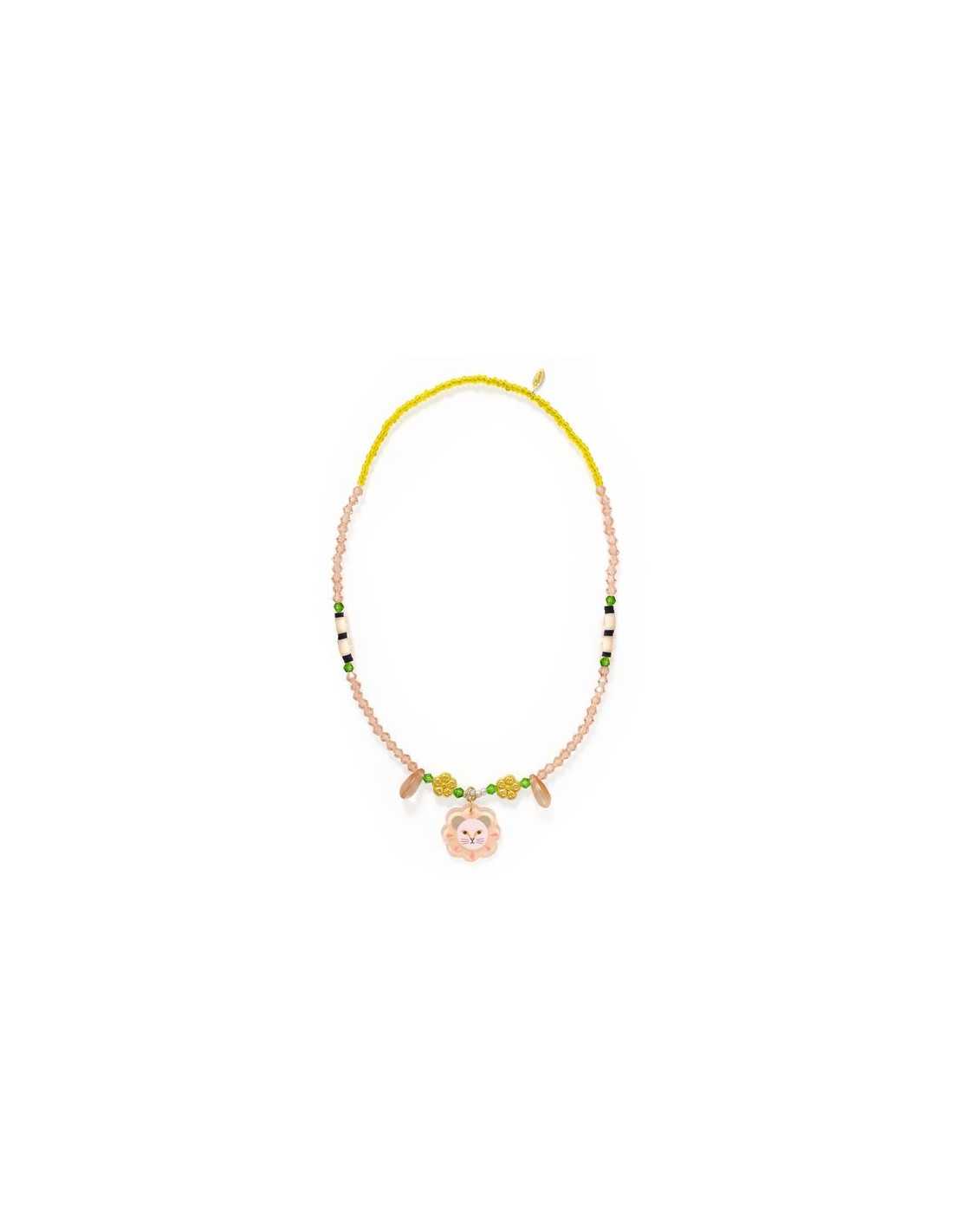 Plongez dans l'univers exotique de la jungle avec ce collier composé de perles en acrylique et de trois charms : un majestueux lion et deux fleurs. Ce collier allie style et résistance. Son double fil élastique assure une solidité optimale tout en garantissant un enfilage facile, sans fermoir.