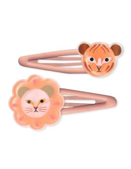 Le set comprend 2 barrettes clip en métal avec 2 éléments différents : tigre et lion en acrylique.