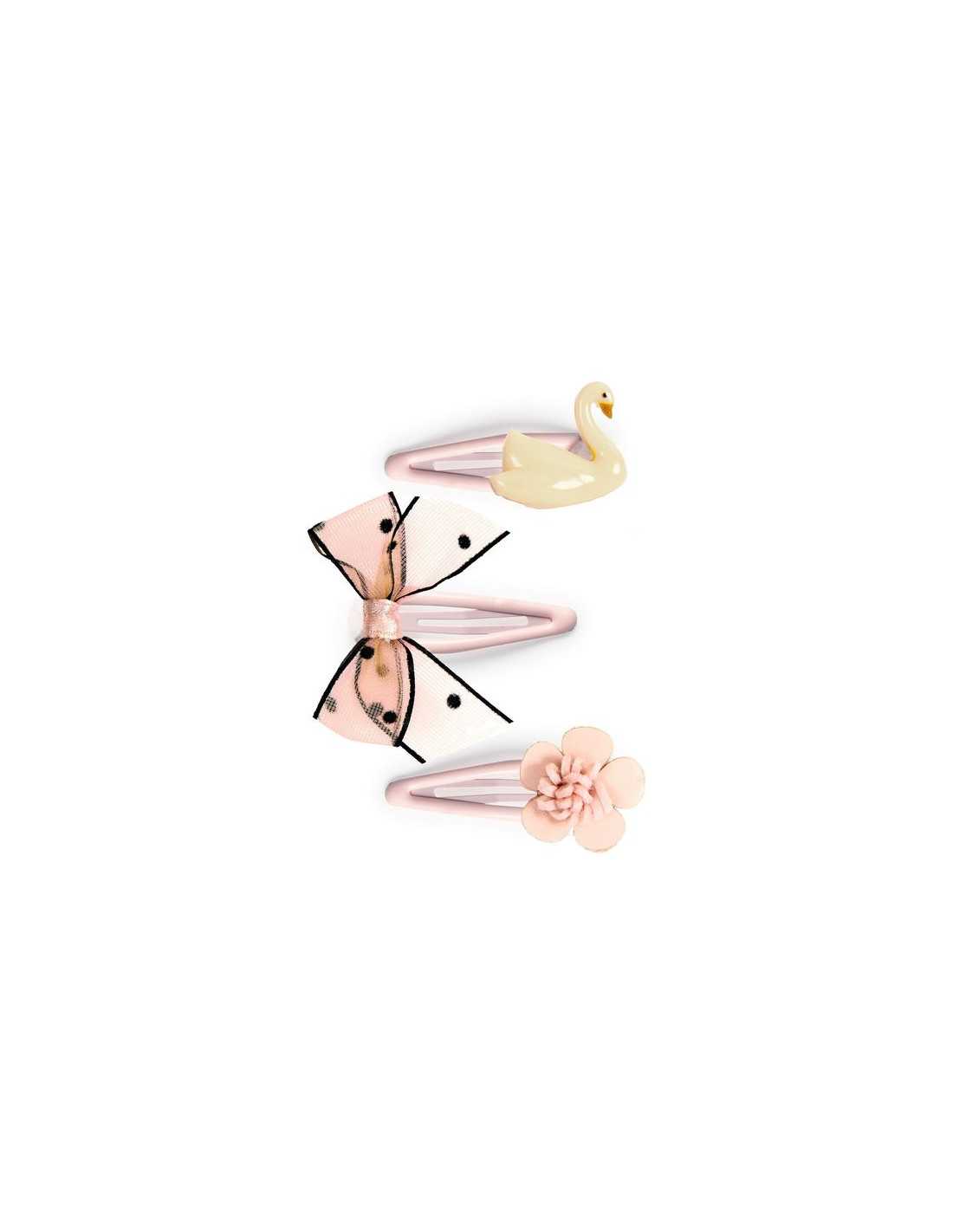 Le set comprend 3 barrettes-clip en métal avec 3 éléments différents : cygne (acrylique), nœud (tulle), fleur (simili-cuir).