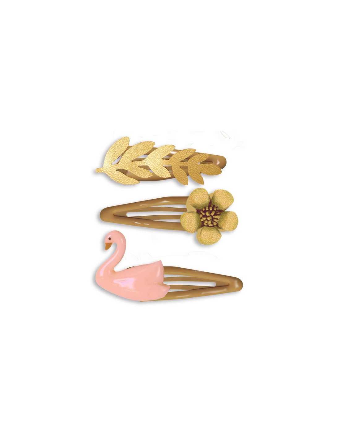 Le set comprend 3 barrettes clip en métal avec 3 éléments différents : feuille (simili-cuir), fleur (simili-cuir) et cygne (acrylique).