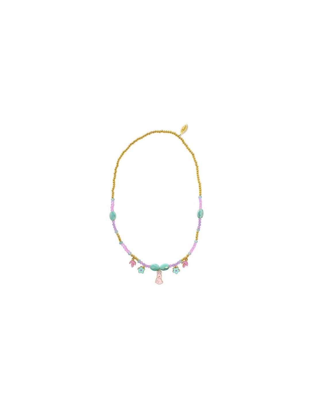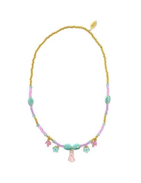 Plongez dans l'univers enchanteur du jardin avec ce collier composé de perles en acrylique et de cinq charms délicats en métal émaillé : deux feuilles, deux fleurs et un lapin. Ce collier allie douceur et poésie. Son double fil élastique assure une solidité optimale tout en garantissant un enfilage facile, sans fermoir.