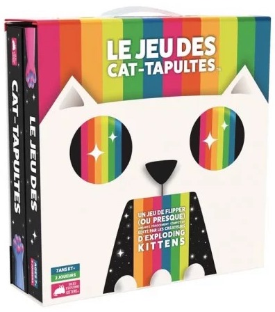 L’éditeur Exploding Kittens propose également un nouveau jeu d’ambiance pour 2 joueurs, un jeu d’adresse dans lequel vous devrez bien viser pour décrocher la victoire, découvrez le jeu des Cat-Tapultes. Le but du jeu est d’envoyer vos balles jaunes dans le camp adverse à l’aide de votre catapulte aimantée. Tentez également de faire tomber les balles blanches et la balle noire du côté de l’adversaire dans le but de remporter des « Ronrons ». Un jeu dynamique pour jouer en famille ou entre amis dès 7 ans.
