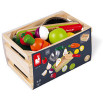 La marchande "Epicerie Green Market" de Janod est une grande marchande en bois vendue avec 32 accessoires : une caisse enregistreuse, une balance, une horloge, une ardoise et une craie pour écrire dessus, des boites d'aliments, des sacs de courses en papier, des fruits, des légumes, des billets et de pièces.