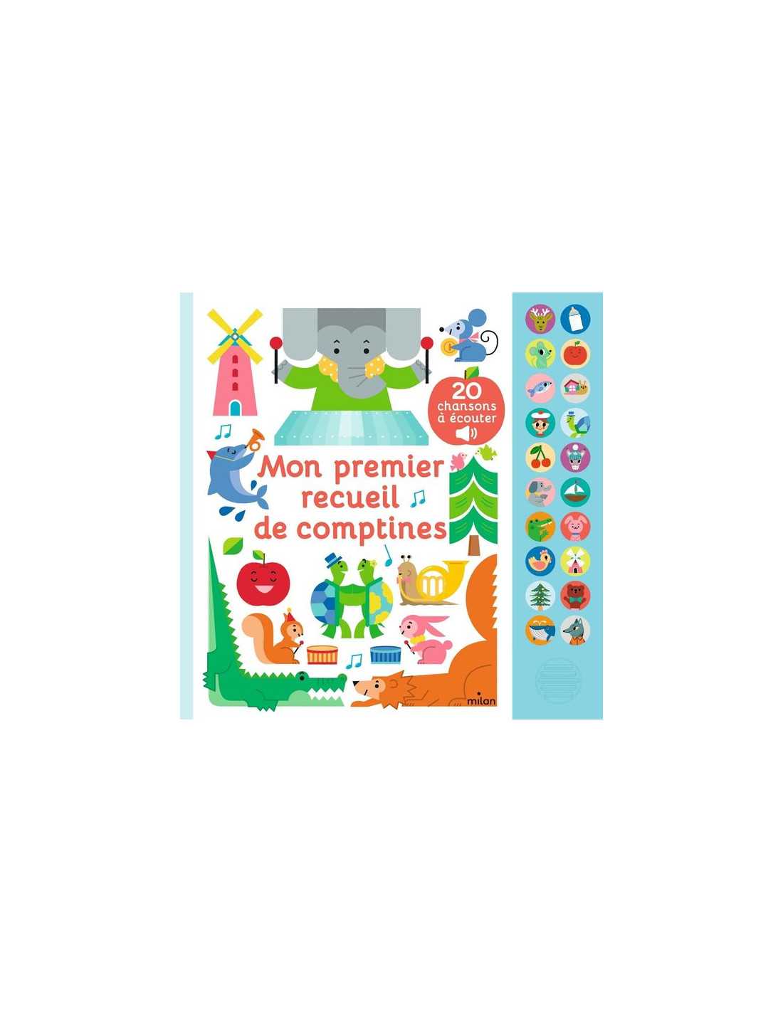 Découvrez Mon premier recueil de comptines des éditions Milan, un livre sonore grand format qui propose une sélection de 20 comptines pour les enfants.