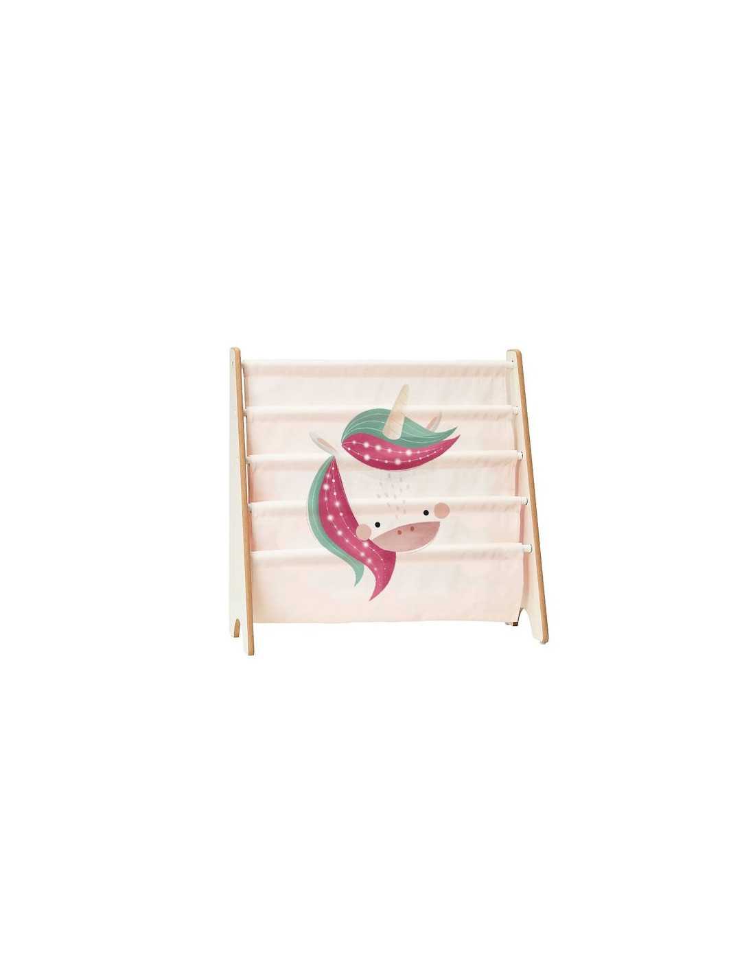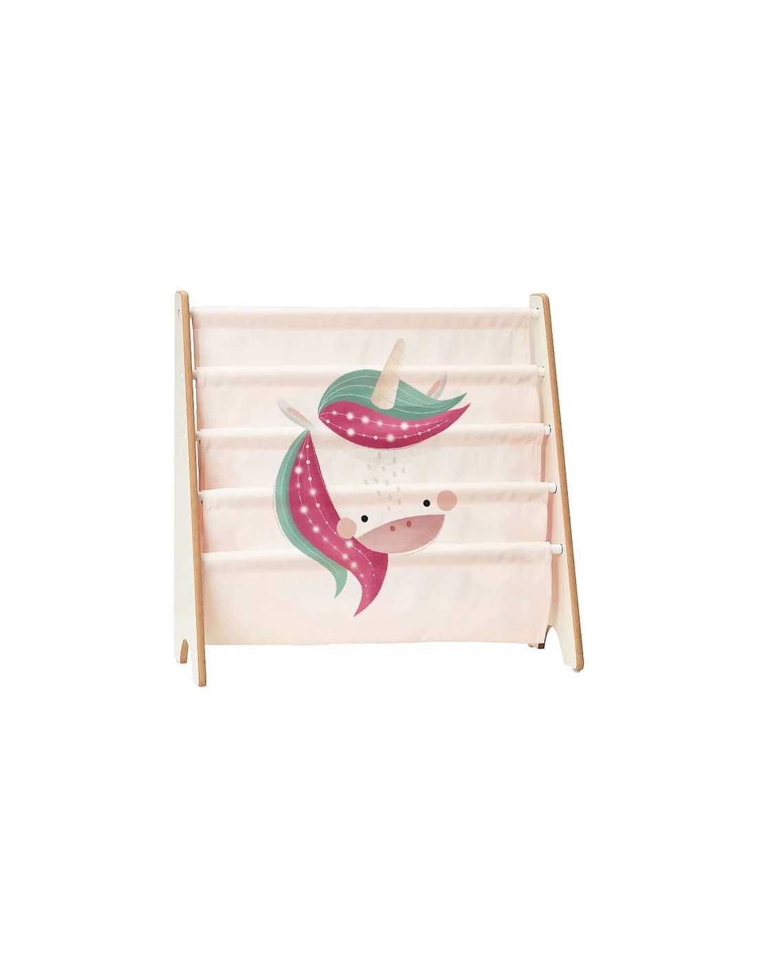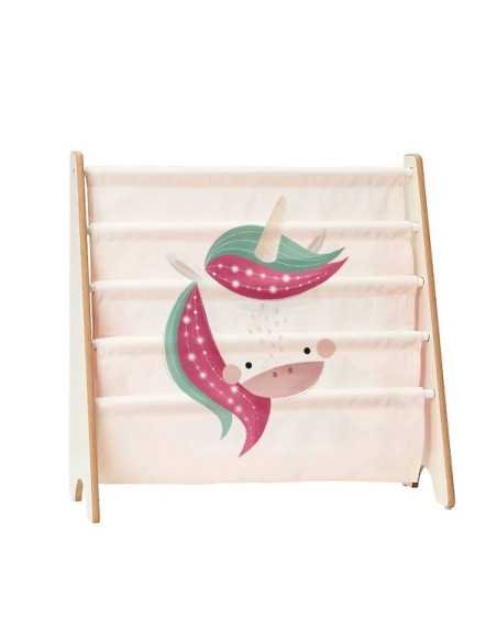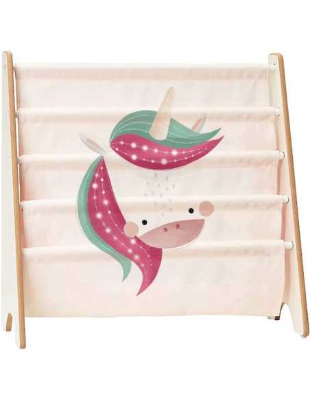Découvrez la bibliothèque Sparkly la licorne de Sassi, une bibliothèque en tissu et en bois pour ranger les livres de votre enfant.