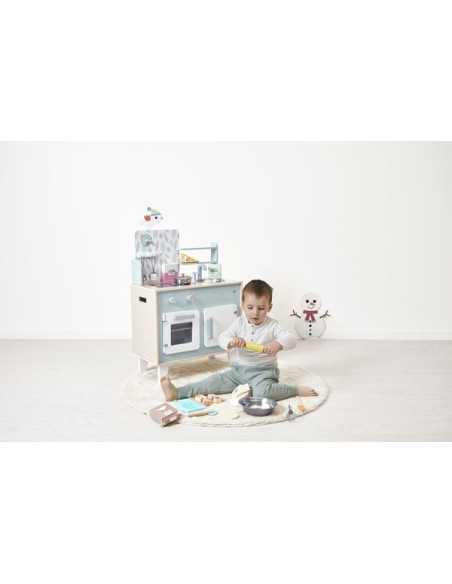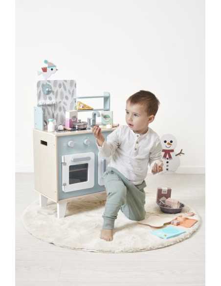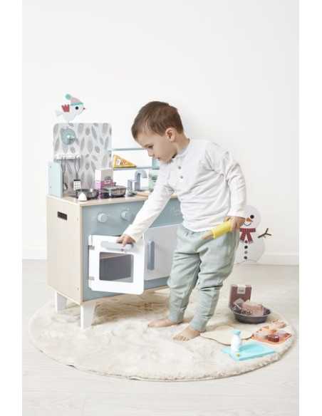 Découvrez la cuisine en bois Plume de Janod, une cuisine toute en bois pour préparer de bons petits plats. Cette cuisine en bois naturel aux tons gris/bleus, à la crédence ornée de délicates plumes, comprend également des accessoires pour cuisinier, ainsi que du son et de la lumière.