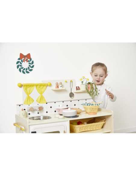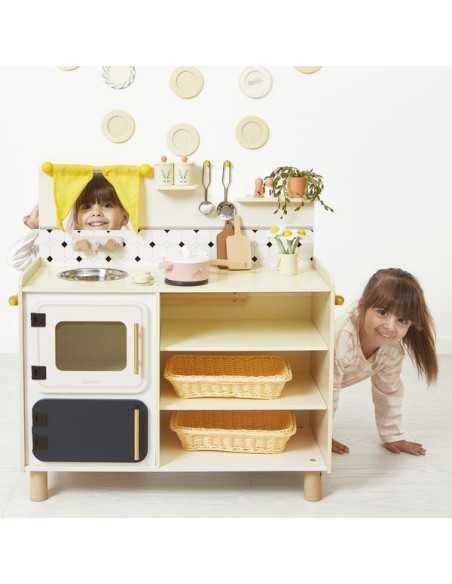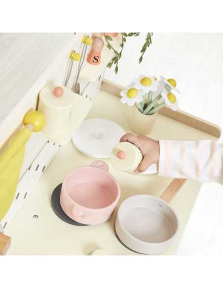 Découvrez la grande cuisine équipée de la collection Mamie Soleil de Janod, une cuisine en bois conçue pour les enfants dès 3 ans, idéale pour préparer de délicieux petits plats.