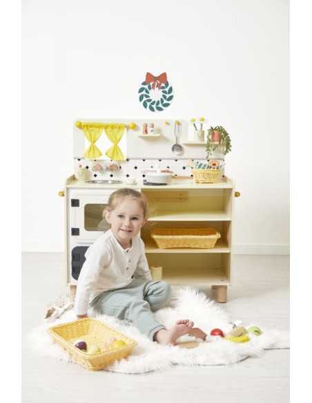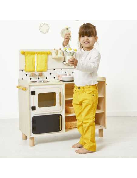 Cette cuisine au design vintage et aux teintes chaleureuses de jaune est équipée d'accessoires variés, de boutons rotatifs et de sons pour simuler de vrais bruits de cuisson. Complet et fonctionnel, ce jouet en bois propose une multitude d'accessoires : 2 casseroles (poêle et marmite), 2 ustensiles (louche et écumoire), 2 pots à épices, 1 salière, 1 poivrière, 2 grandes panières, 2 planches à découper, 1 vase, 1 bouquet de fleurs et 1 plante verte.