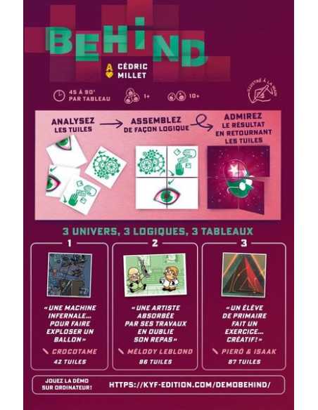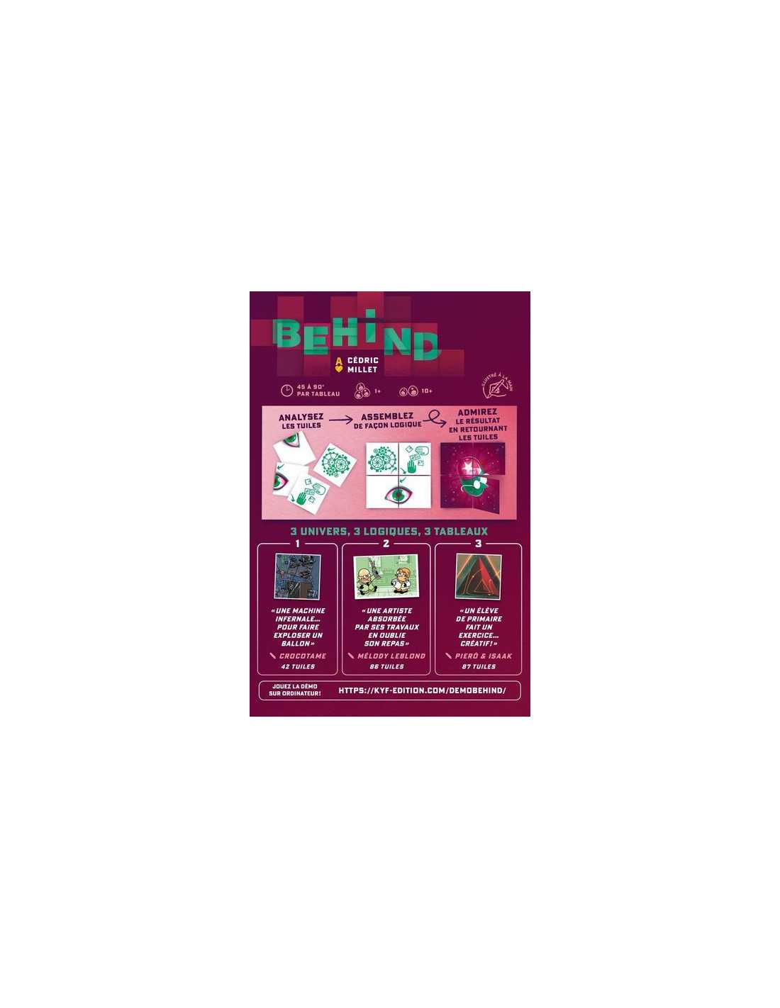 Découvrez le jeu Behind purple de KYF Edition, un casse-tête coopératif à partir de 10 ans pour jouer seul ou à plusieurs. Embarquez pour 3 nouvelles enquêtes, avec chacune leur logique et leur univers : "la Machine Infernale" de Crocotame, "Le Repas " de Melody Leblond et enfin "Le Cahier" de Pierô et Isaak.