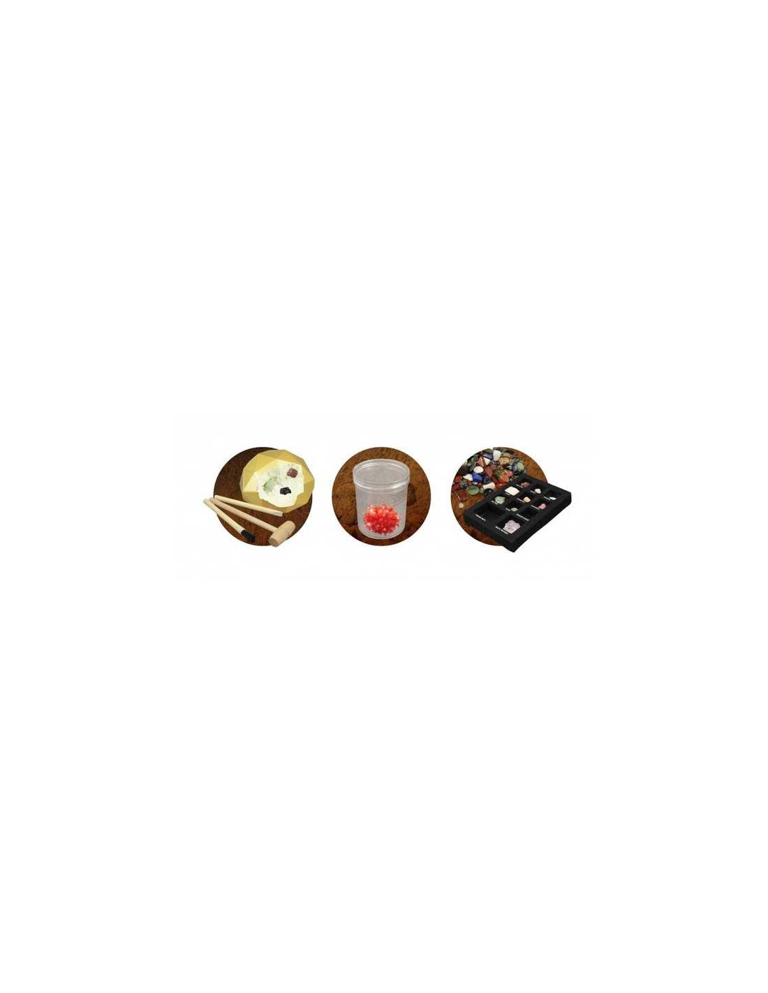 Avec les outils, déterre 8 véritables pierres brutes. Trouve leurs versions polies dans le sac (300 g) et compare-les avec la loupe. Fais pousser des cristaux géants et des cristaux instantanés. Observe une grande variété de roches remarquables : pierres volcaniques, quartz, or des fous, roche fluorescente, agate polie, cristal de bismuth…
