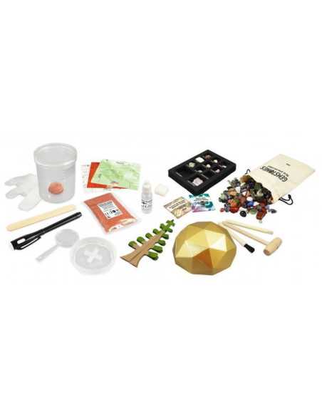 Le coffret comprend 1 gobelet, poudre à cristaux (90 g), 1 paire de gants, 1 support, 1 bâtonnet mélangeur, 1 arbre à cristaux, 1 solution liquide de cristaux (20 ml), 1 bloc de plâtre (8 pierres à déterrer), 1 marteau, 1 burin, 1 pinceau, 1 éponge, 1 loupe, 1 sac de pierres polies (150 pierres), 8 cartes à plier, 1 plateau, 1 stylo encre UV, 1 sachet surprise (Agate Polie), 1 sachet surprise (Cristal de bismuth) et 1 notice illustrée.