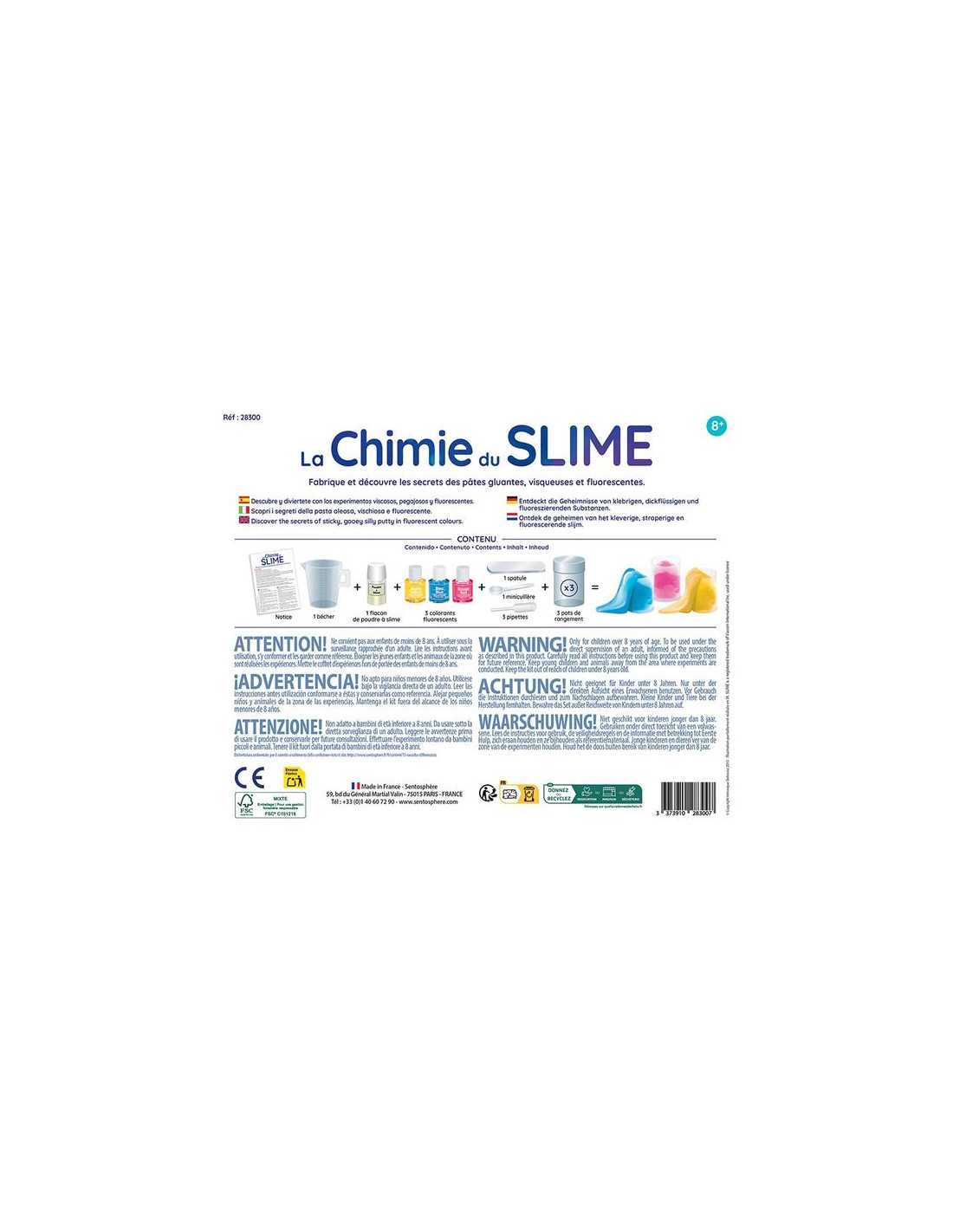 Découvrez le coffret La Chimie du Slime de Sentosphère, un superbe coffret scientifique fabriqué en France permettant aux enfants, dès 8 ans, de fabriquer, en quelques minutes et avec une manipulation à froid sans danger, une pâte visqueuse, complètement délirante, appelée Slime.