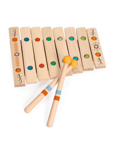 Le coffret comprend 1 xylophone en bois, 2 baguettes en bois et 2 partitions recto-verso en carton.