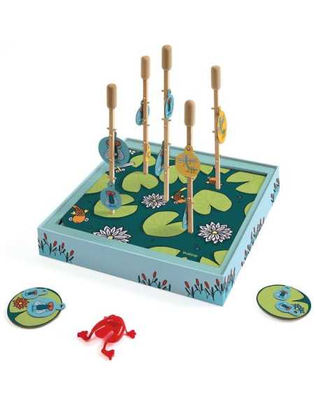 La boite de jeu contient 1 boîte plateau avec 5 tiges roseaux, 21 tuiles à suspendre, 4 plateaux nénuphar et 2 grenouilles sauteuses et la règle de jeu.