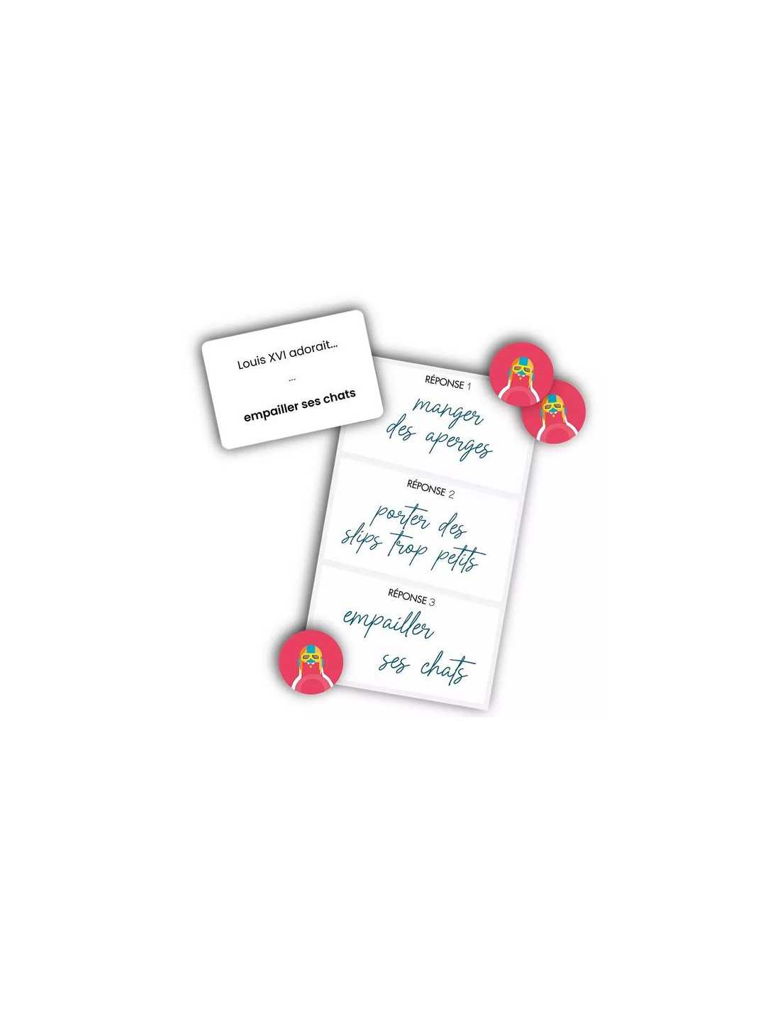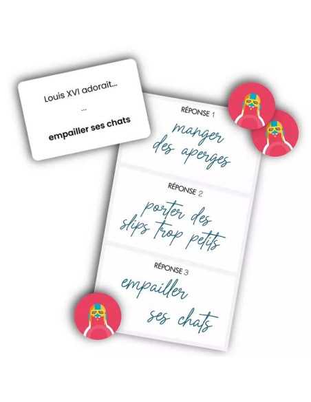 Le jeu contient 440 cartes questions, 32 jetons pigeon, 1 bloc réponse et la règle du jeu.