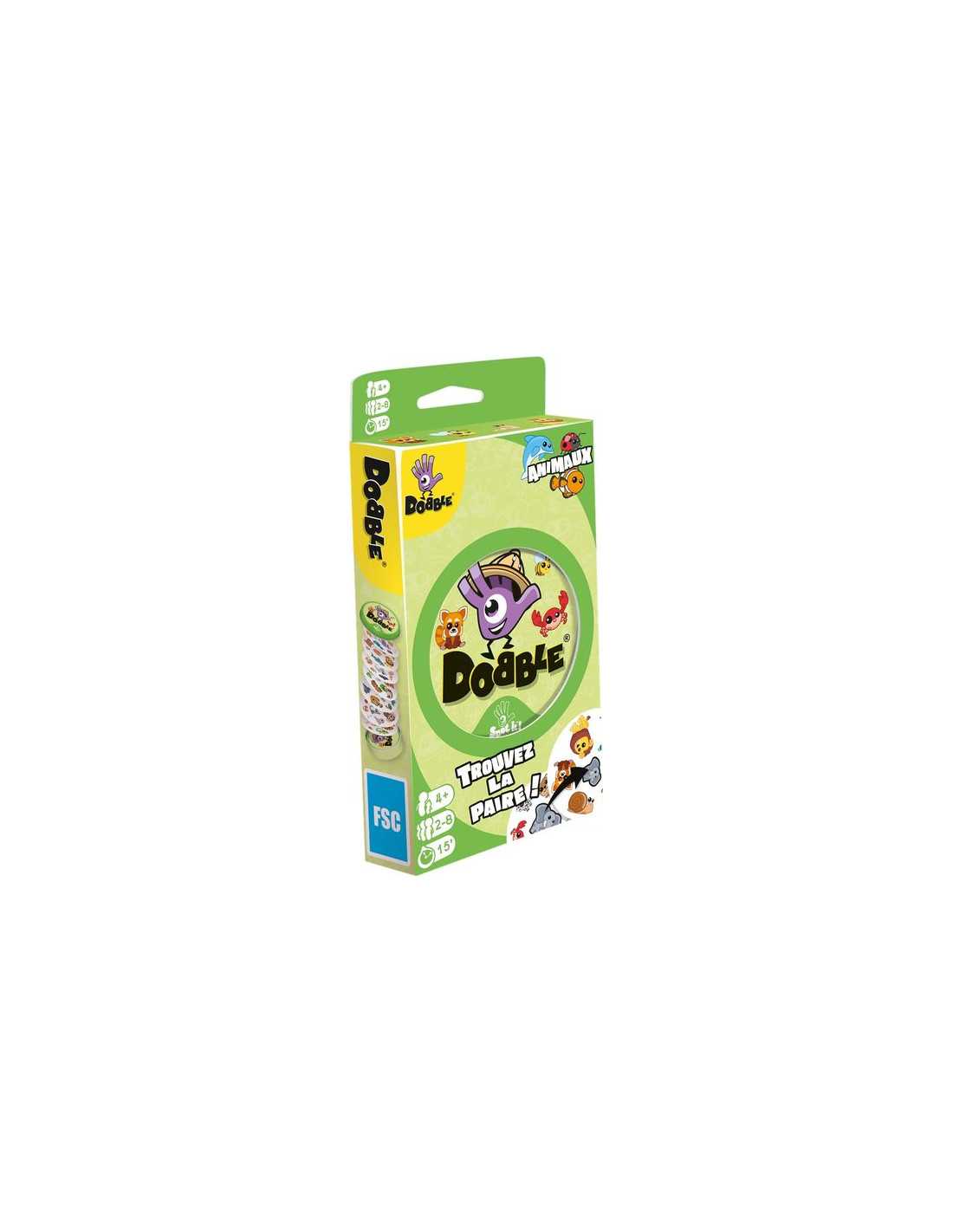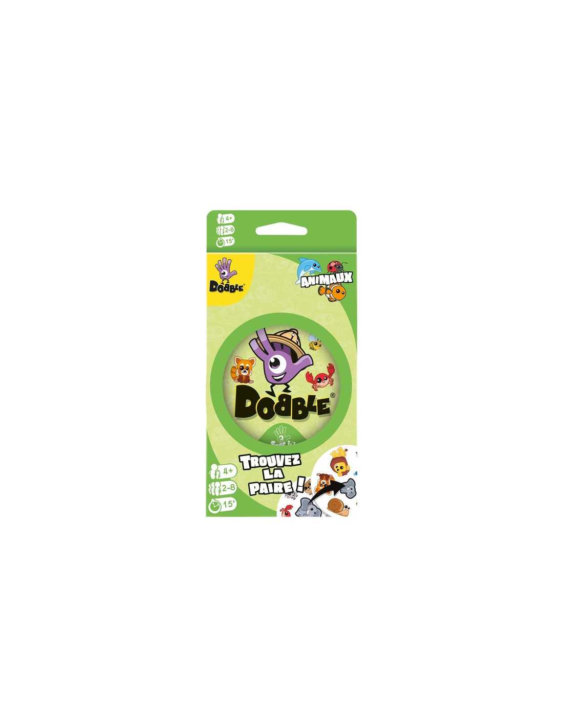 Découvrez le jeu Dobble animaux, un jeu d'ambiance, d’observation et de rapidité dans lequel tous les joueurs jouent en même temps. Un jeu au thème animalier pour jouer de 2 à 8 joueurs à partir de 4 ans. Dobble, c'est 55 cartes, 6 animaux par carte et toujours un et unique animal identique entre chaque carte. Repérez plus vite que vos adversaires l’animal en commun entre deux cartes.