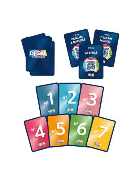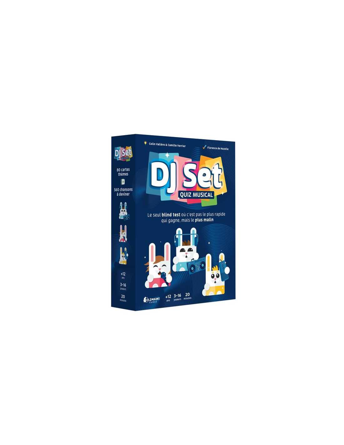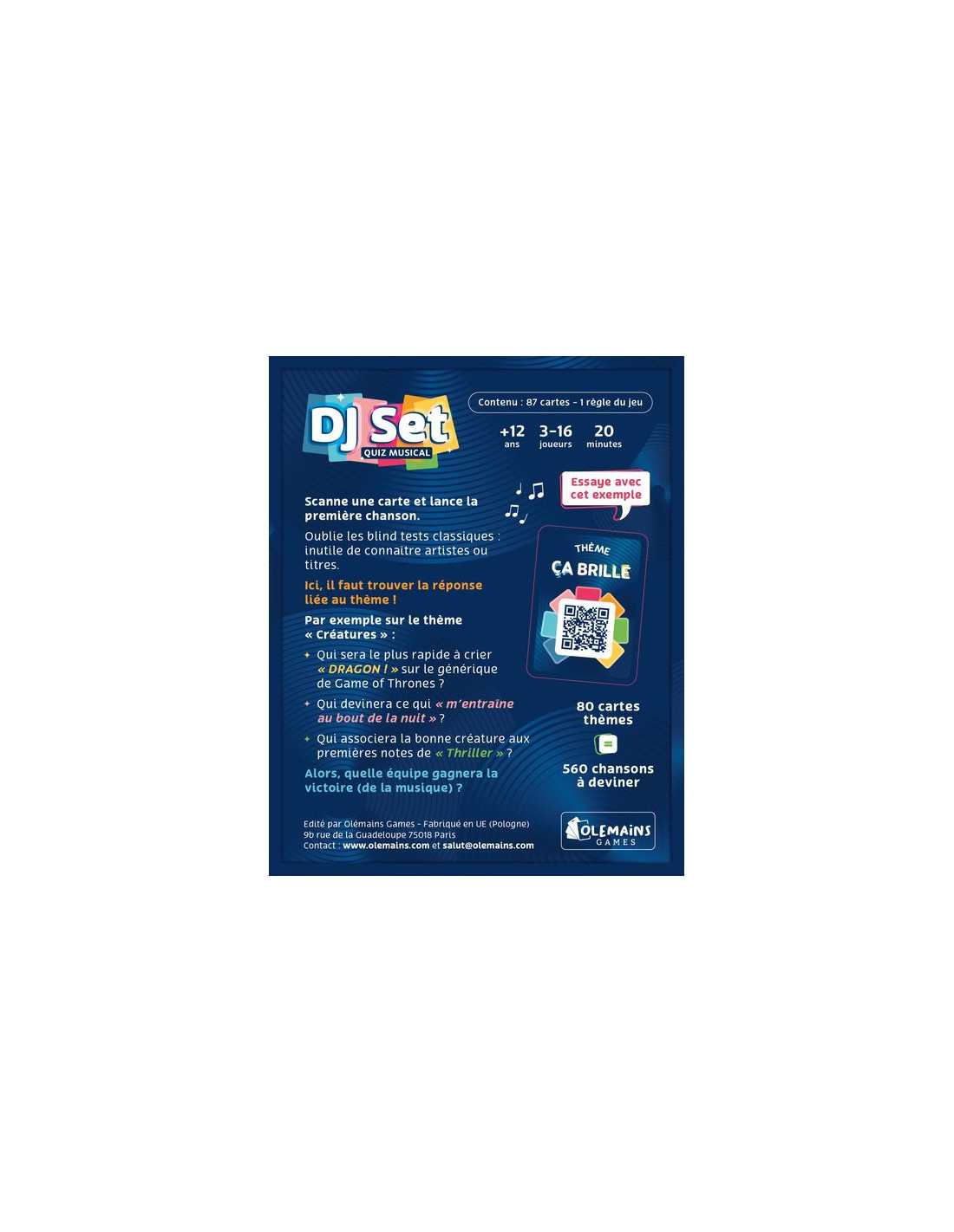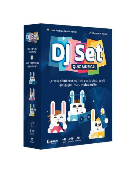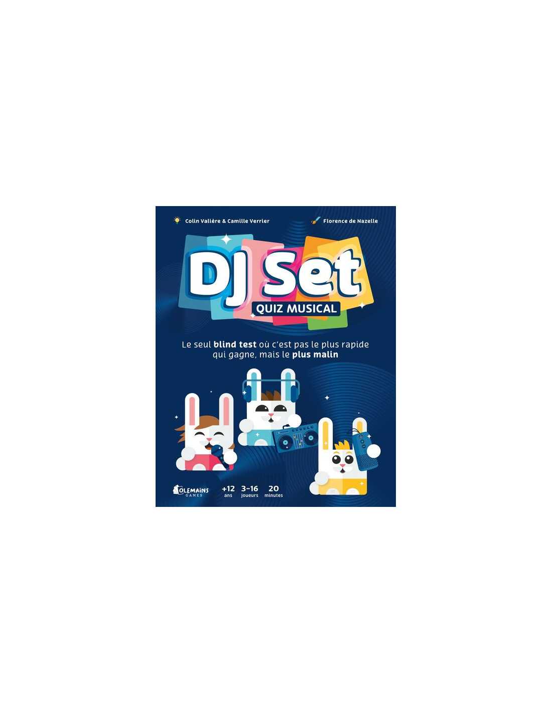 Dans DJ set, les joueurs répondent à des questions originales sur chaque titre. Toutes les musiques sont accessibles en un clic pour toutes vos soirées en famille ou entre amis. DJ set propose 560 musiques variées (tubes d’hier et d’aujourd’hui, musiques de films / séries, ...) qui sont en lien avec 80 thèmes feel good et surprenants.