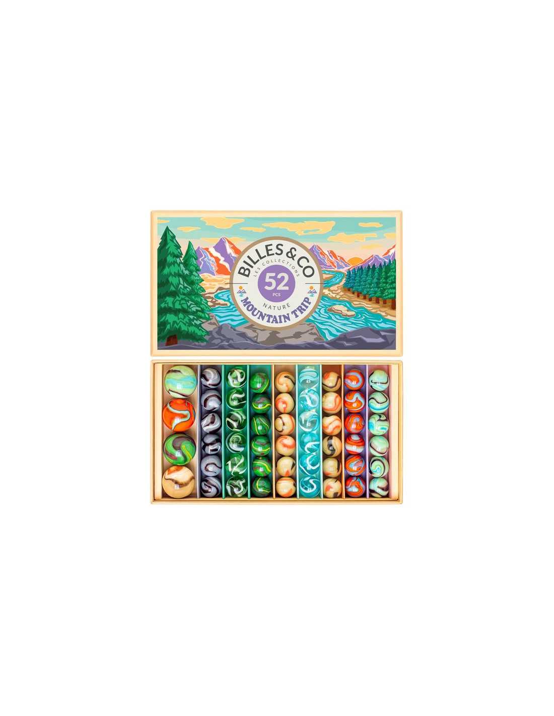 Découvrez le coffret de 52 billes Mountain Trip de Billes & Co. Billes et calots dans un splendide coffret cadeau pour une ballade en pleine nature. Billes & Co met en valeur ces petites boules de verre avec lesquelles tous les enfants ont joué afin d’en faire des “trésors de pierres précieuses”.