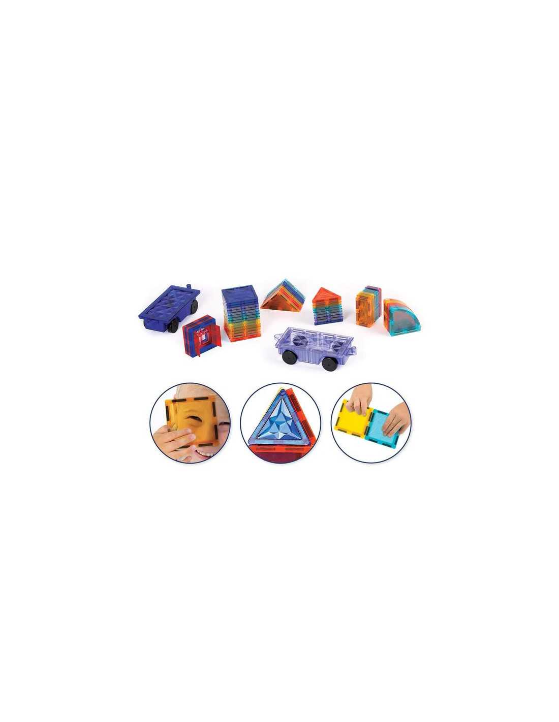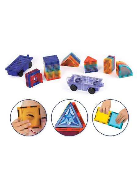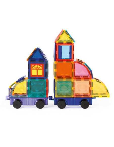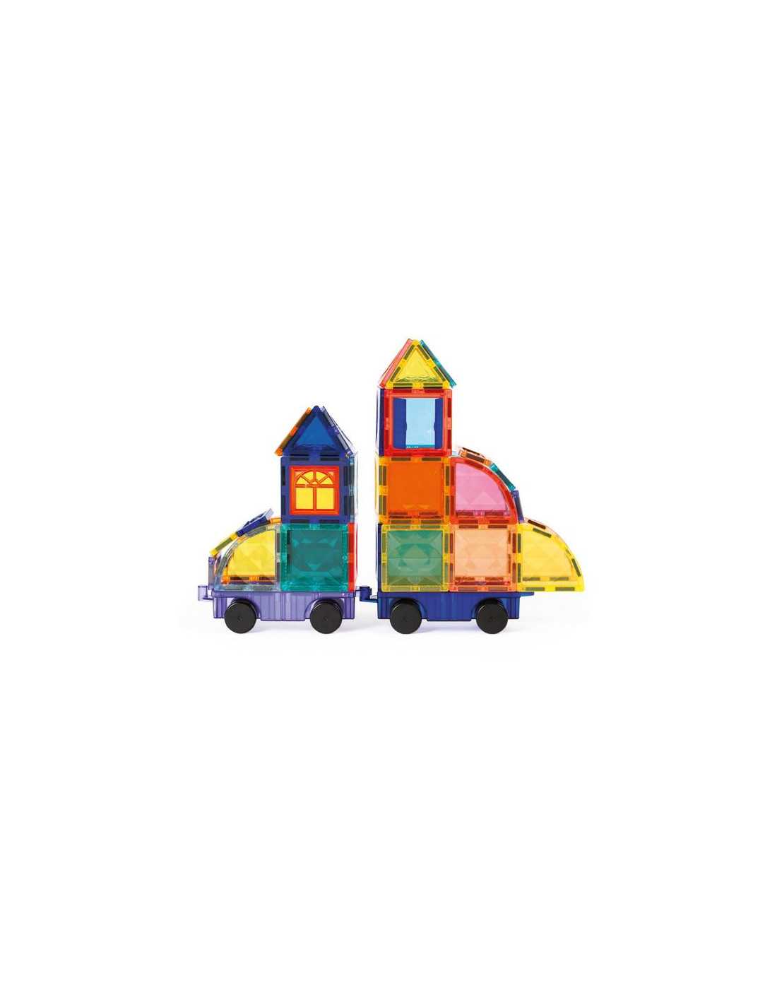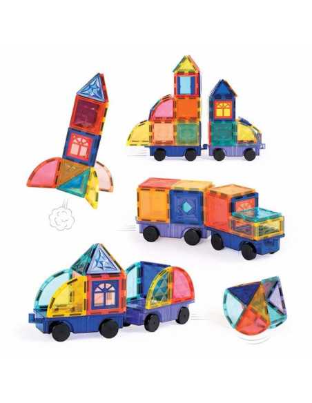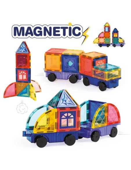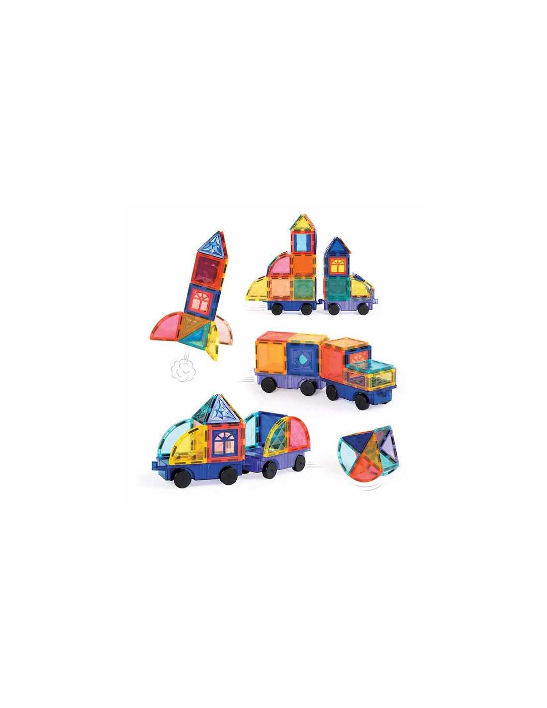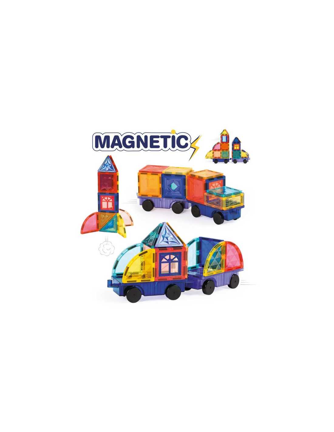 Un jeu de construction aimanté créatif et éducatif. Cette valisette pratique réunit 63 pièces magnétiques colorées et transparentes pour imaginer des constructions en 2D et en 3D. Grâce à deux bases de véhicules à roulettes, les enfants peuvent assembler leurs créations pour former des trains, camions, voitures, fusées et bien plus encore.
