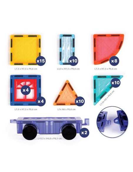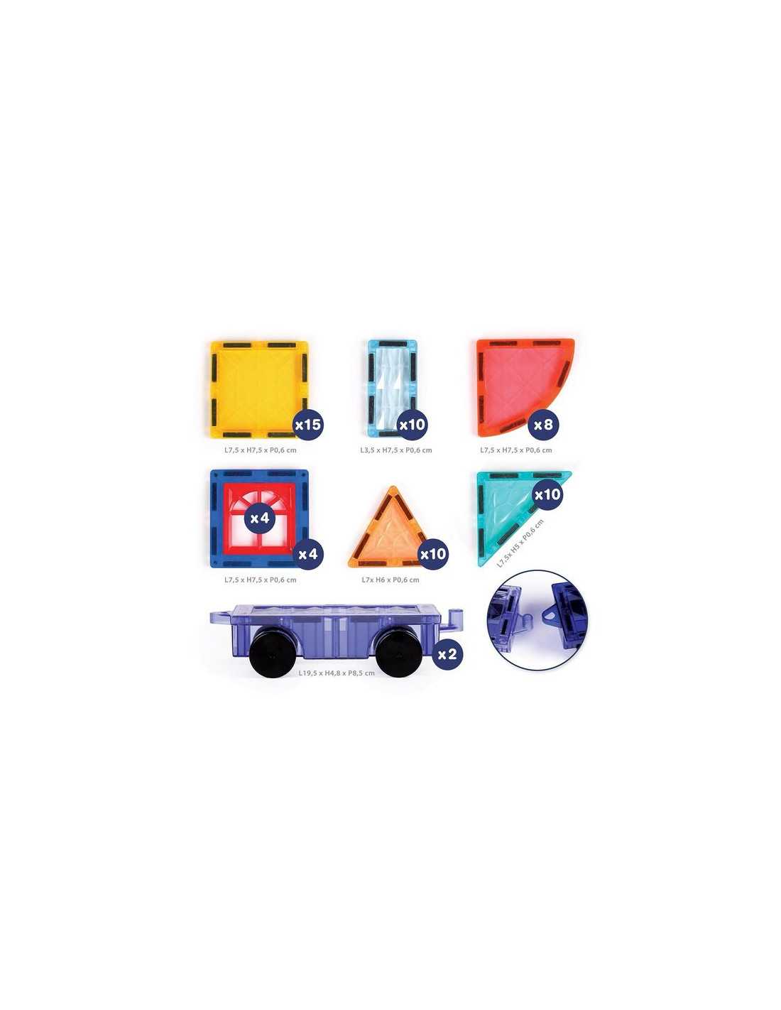 Le coffret comprend 63 pièces magnétiques : 15 carrés, 8 quarts de cercles, 10 rectangles, 20 triangles, 4 fenêtres et 2 bases de véhicules.