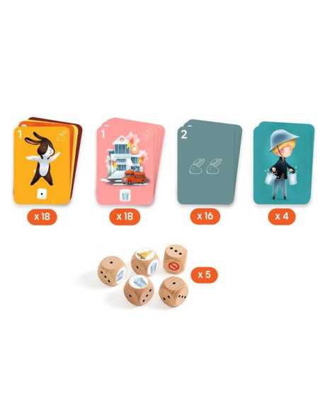 La boite de jeu contient 5 dés, 62 cartes et la règle de jeu.