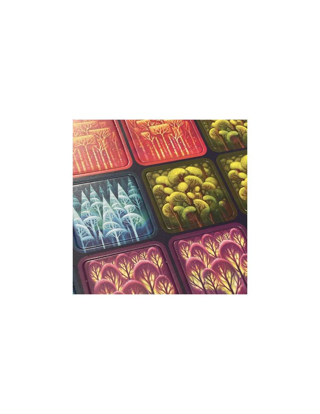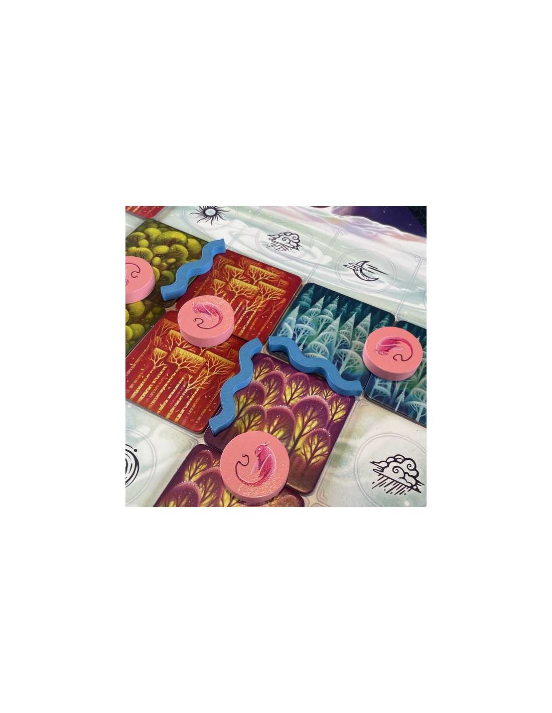 La boite de jeu contient 60 tuiles "Forêt", 24 pions "Rivière", 48 pions "Animal", 8 tuiles "Aurore", 33 cartes "Objectif", 1 plateau central, 4 plateaux "Joueur" et la règle du jeu.