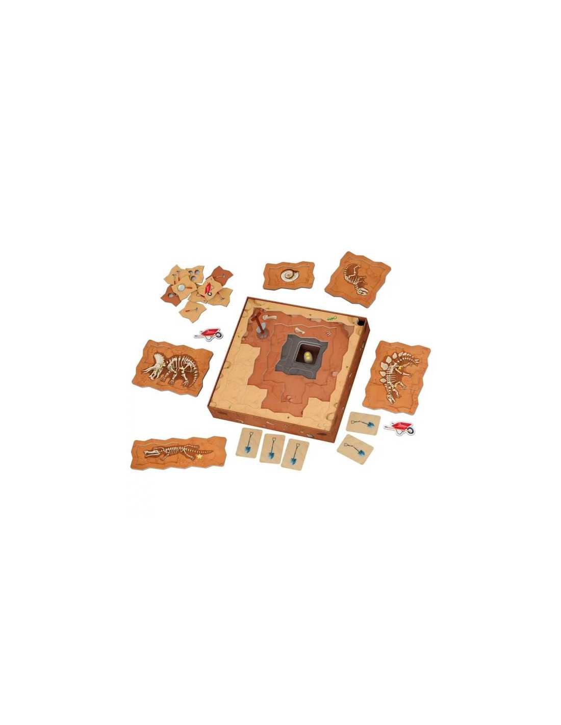 La boite de jeu contient 1 terrain de fouilles, 50 tuiles "Terrain", 4 tuiles "Découverte", 5 plateaux "Fossile", une pelle ventouse, 3 œufs en bois, 1 jeton hexagonal, 5 jetons "Brouette", 11 cartes et la règle du jeu.