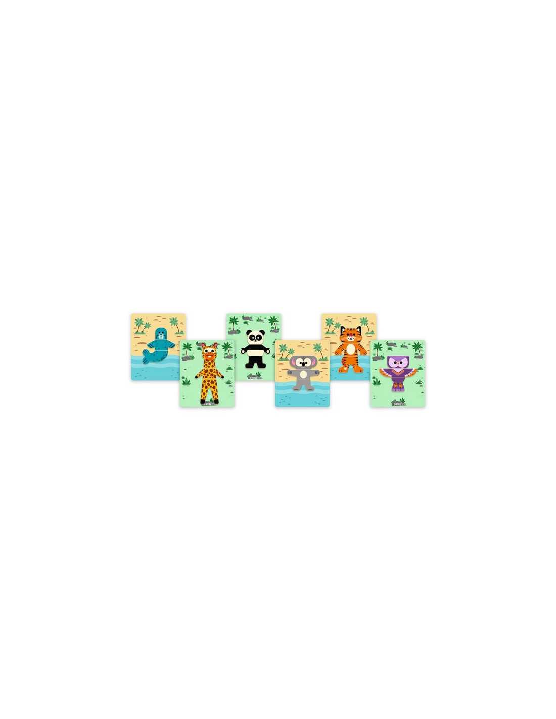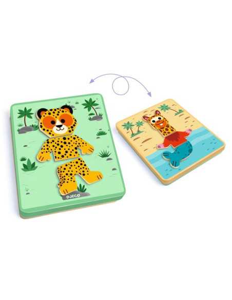 L'enfant joue avec des magnets en bois sur une boîte métallique. Il reproduit les 8 animaux représentés sur les cartes en choisissant le bon côté de la boîte. Il peut également laisser libre cours à son imagination en créant des mélanges rigolos.