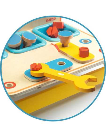 Un mini-établi pour jouer assis ou sur une table, un jouet peu encombrant et facile à déplacer. Un cadeau idéal pour développer la motricité fine et l’imagination des garçons et des filles.