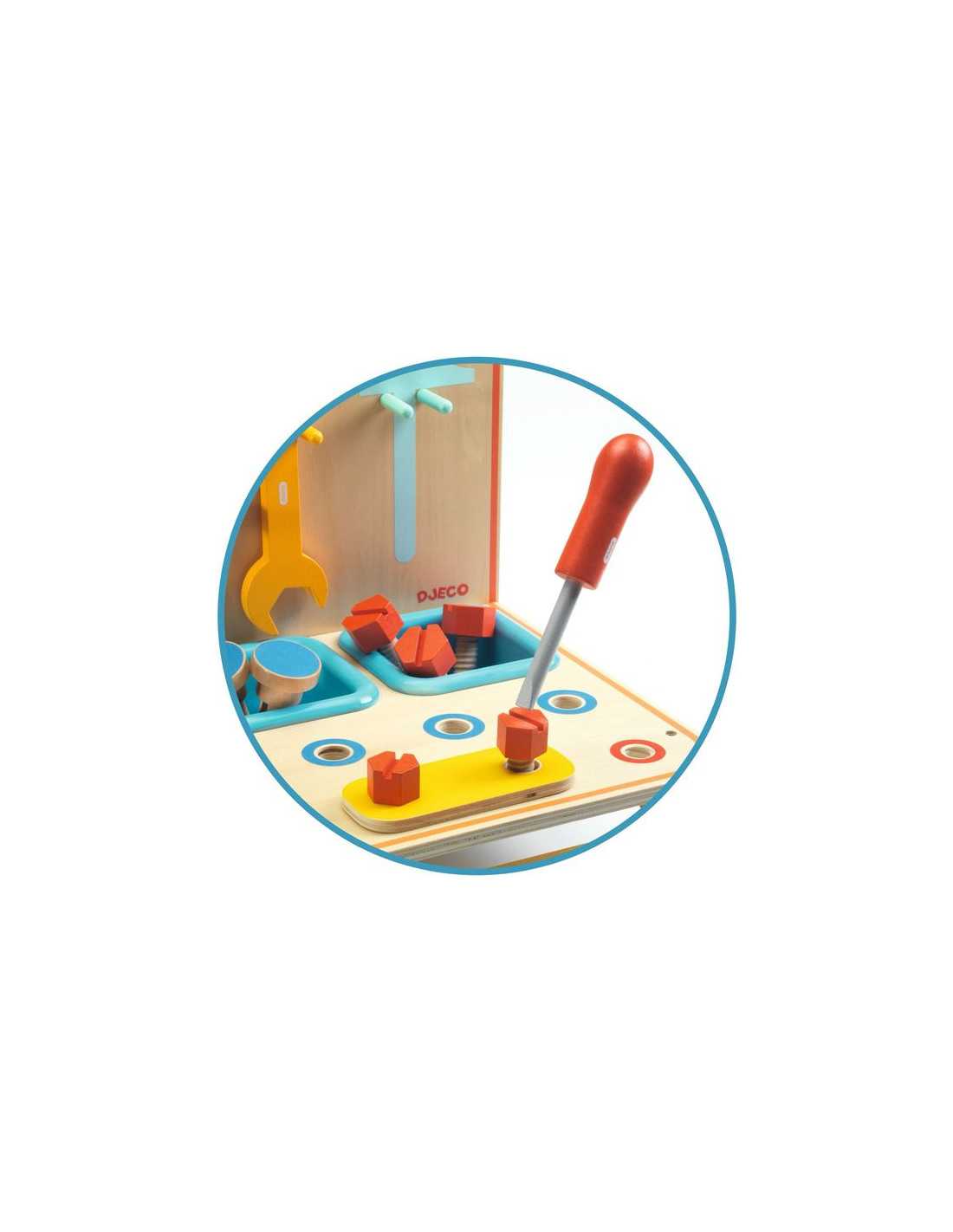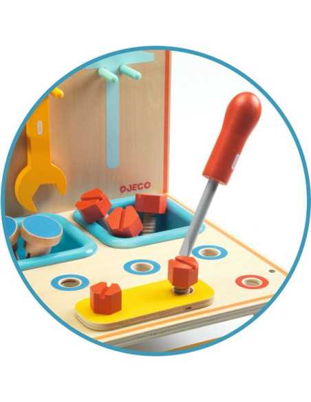 Un établi compact livré avec 18 outils en bois, parfait pour les petits bricoleurs en herbe. Chaque outil est parfaitement dimensionné pour s'adapter aux petites mains des enfants, facilitant ainsi leur manipulation. Ce jeu d'imitation possède également 3 petits bacs permettent de trier et ranger les accessoires.