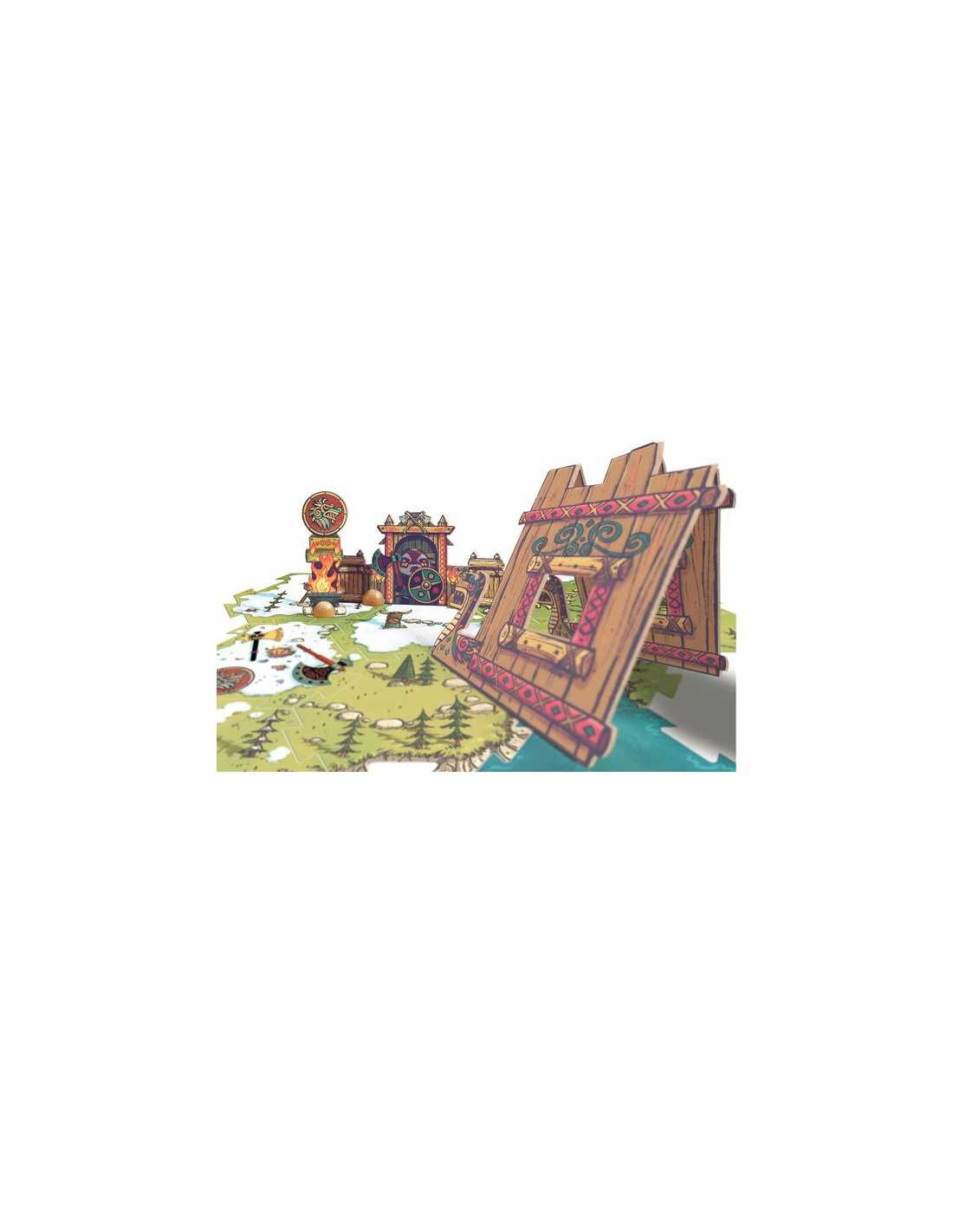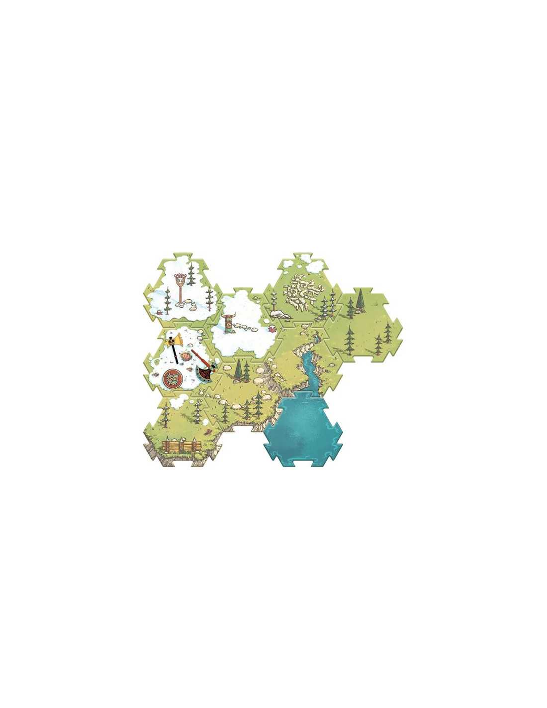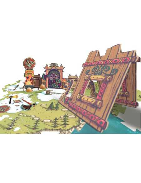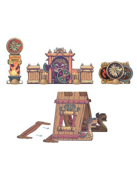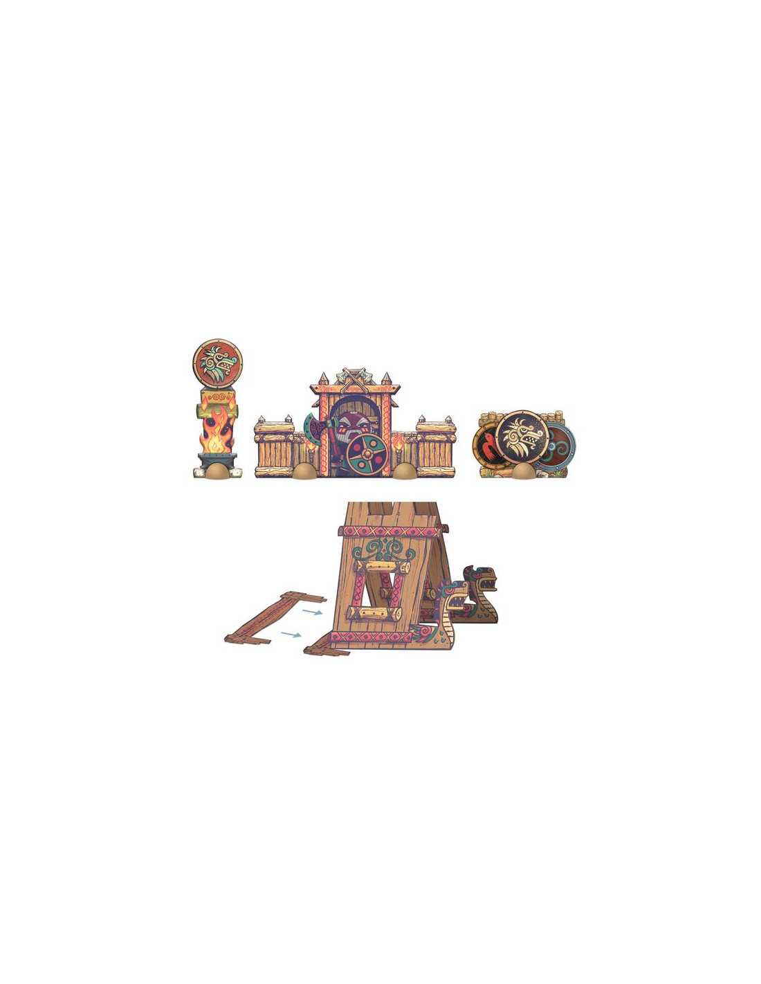 Le coffret comprend 1 figurine, 2 accessoires, 1 puzzle de sol de 8 pièces, 4 éléments de décors montés sur des pions en bois : 1 totem, 1 support d'armes, 1 abri et 1 lieu de rassemblement.