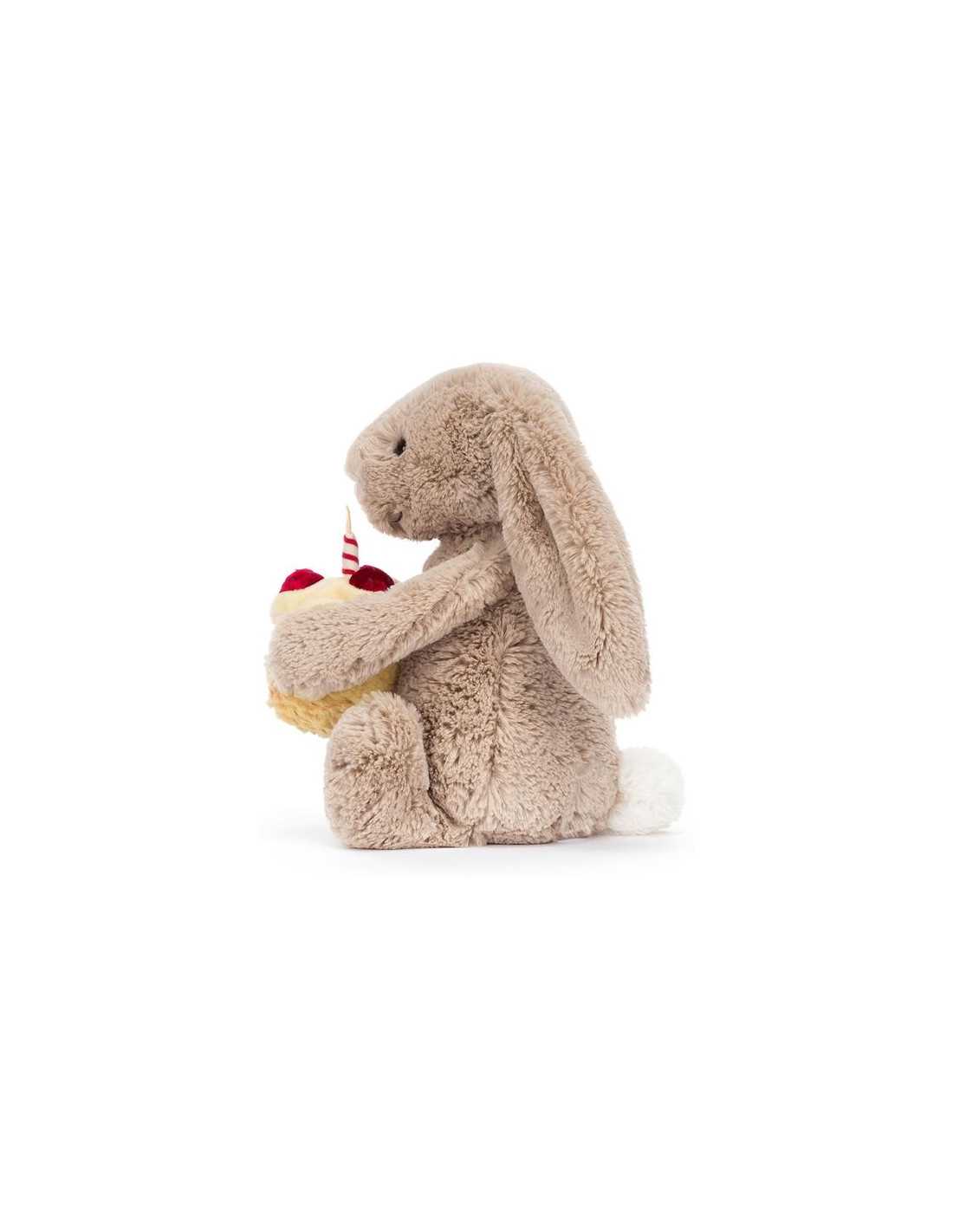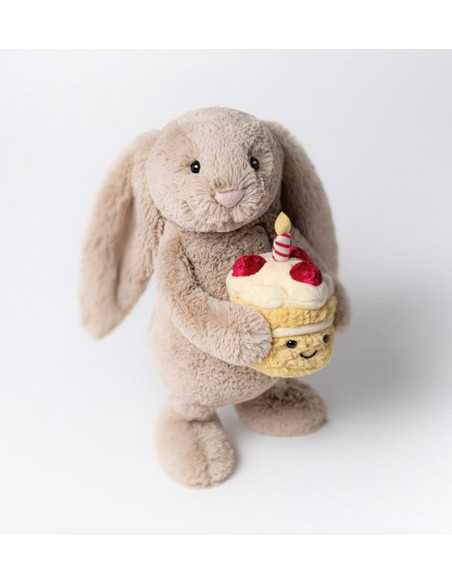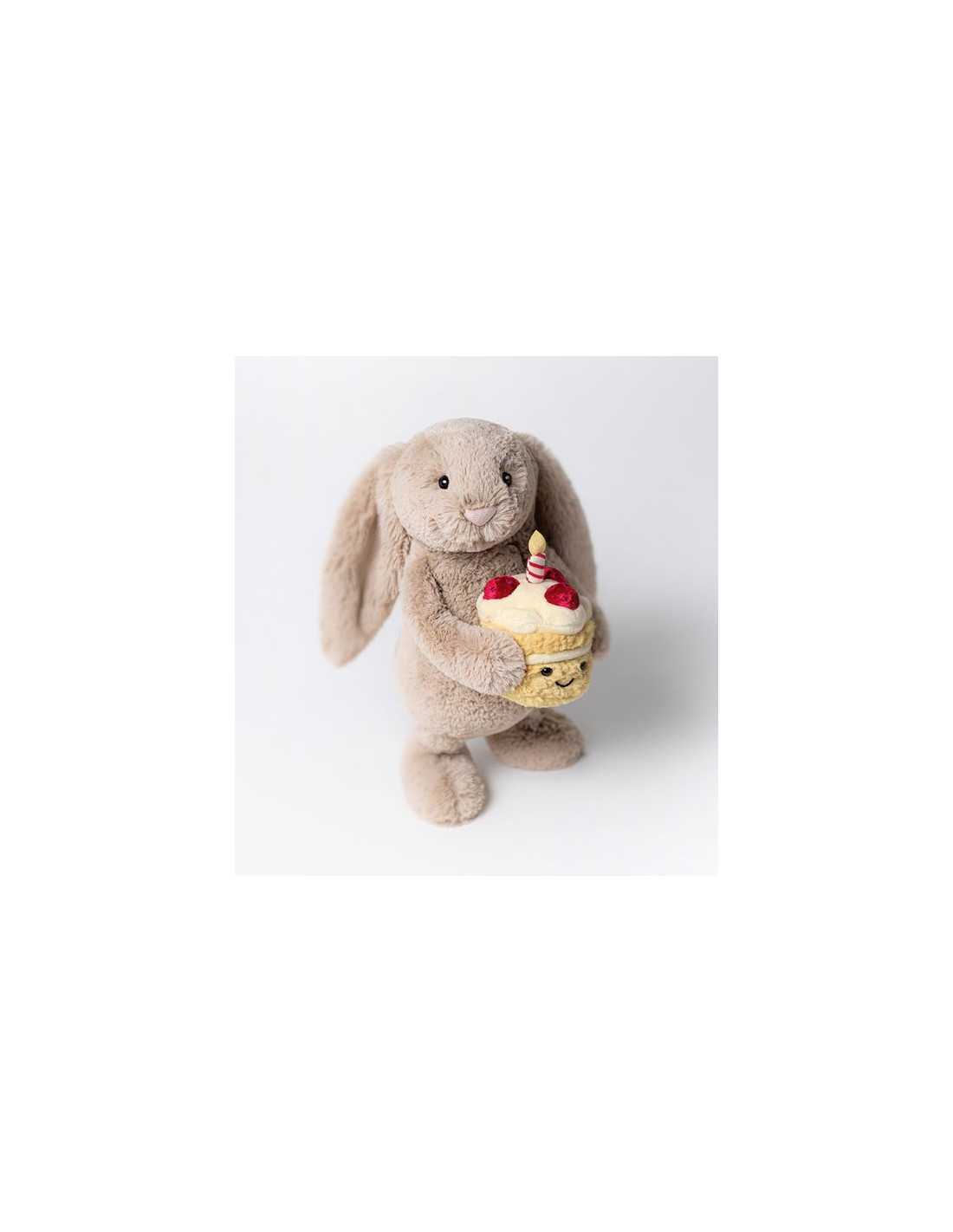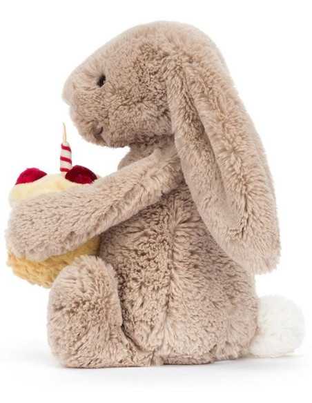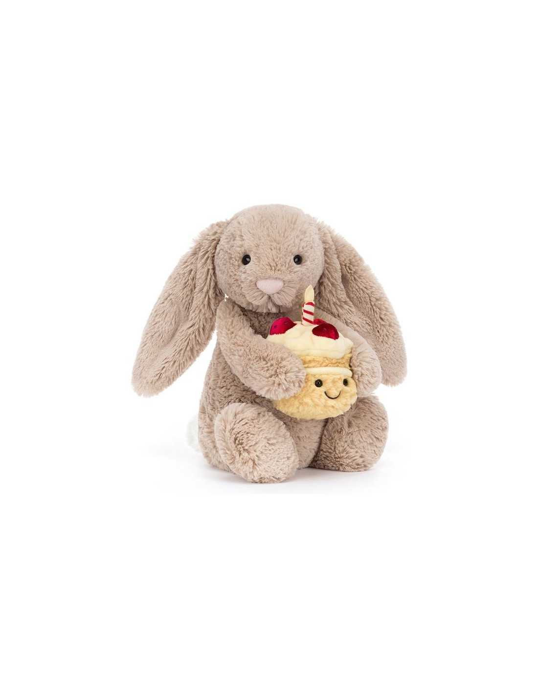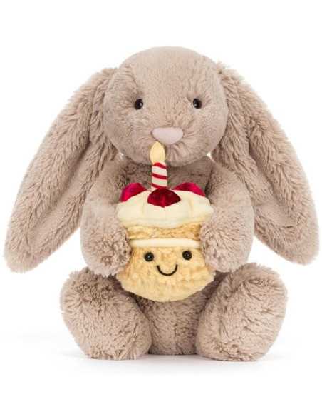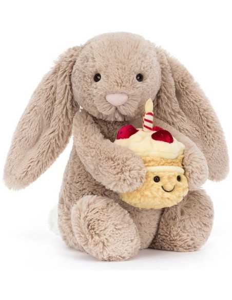 Un joli lapin avec un gâteau d'anniversaire entre les pattes, une belle idée de cadeau à offrir pour un premier anniversaire.