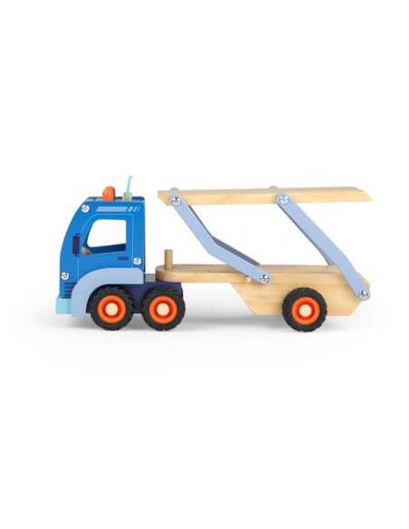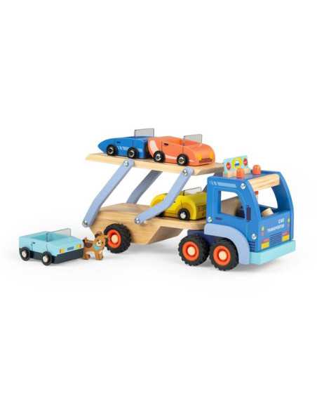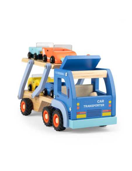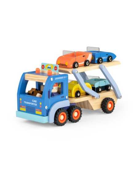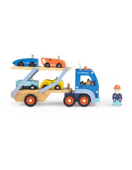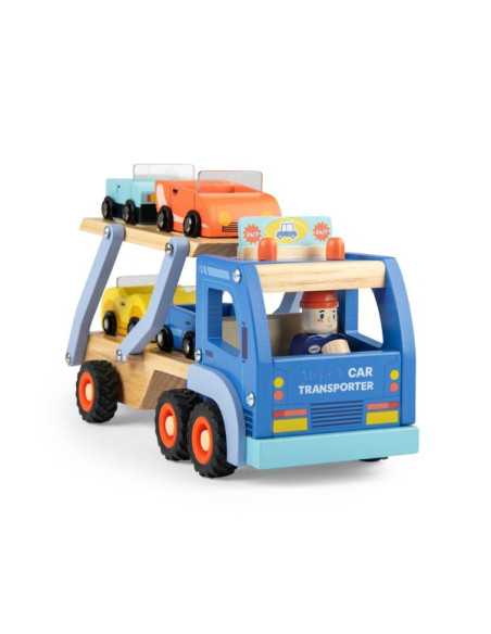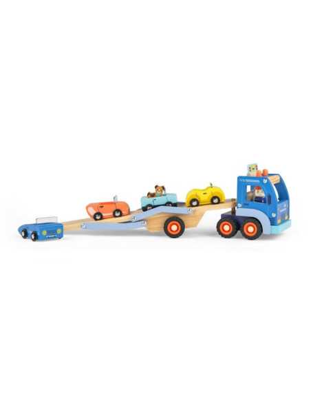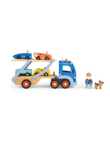 Découvrez le Camion de transport de voitures de la collection Avenue du Moulin de Moulin Roty, un grand camion en bois avec 4 voitures et 2 personnages pour divertir et stimuler l'imagination des enfants dès 3 ans.