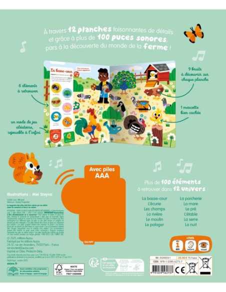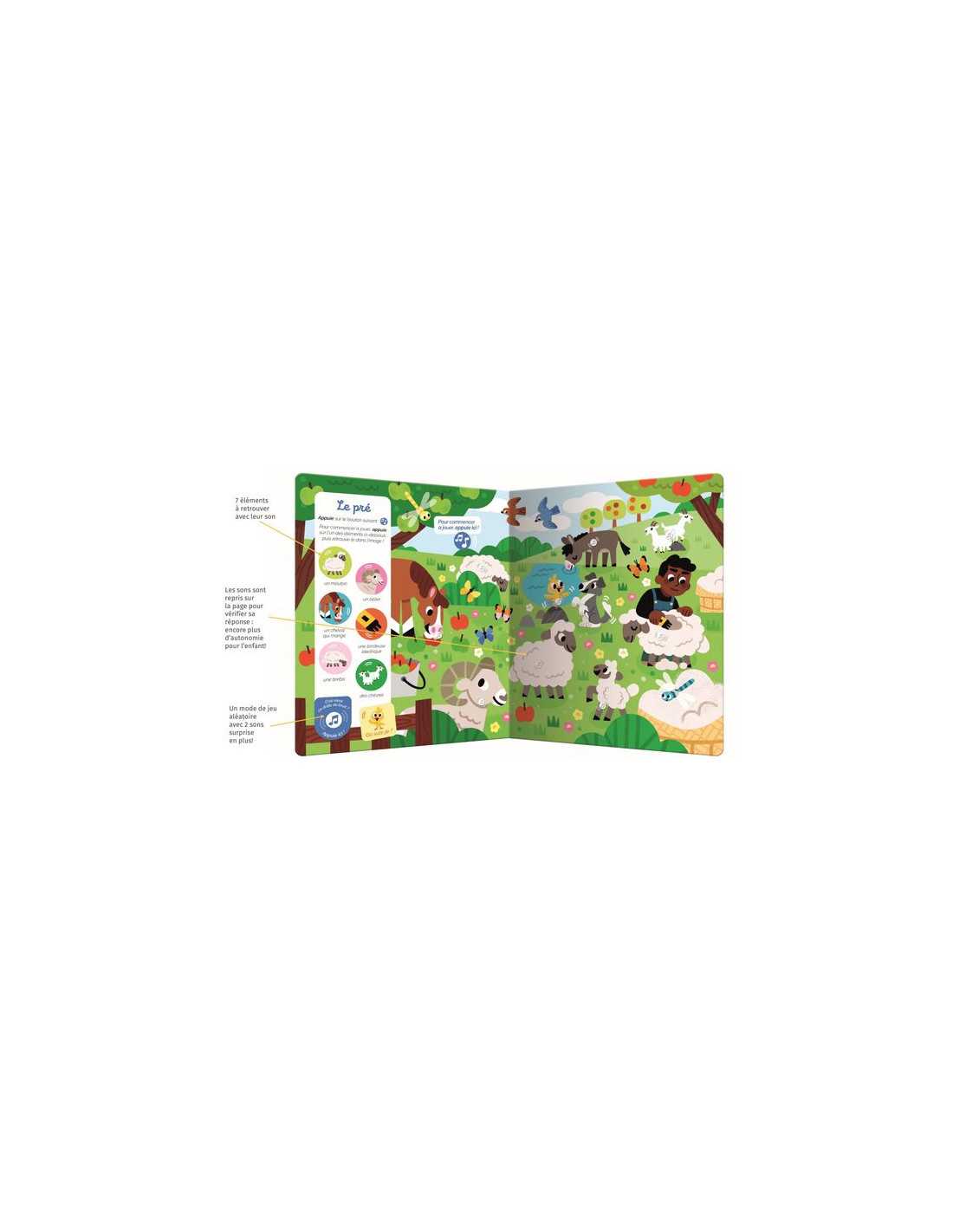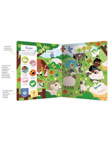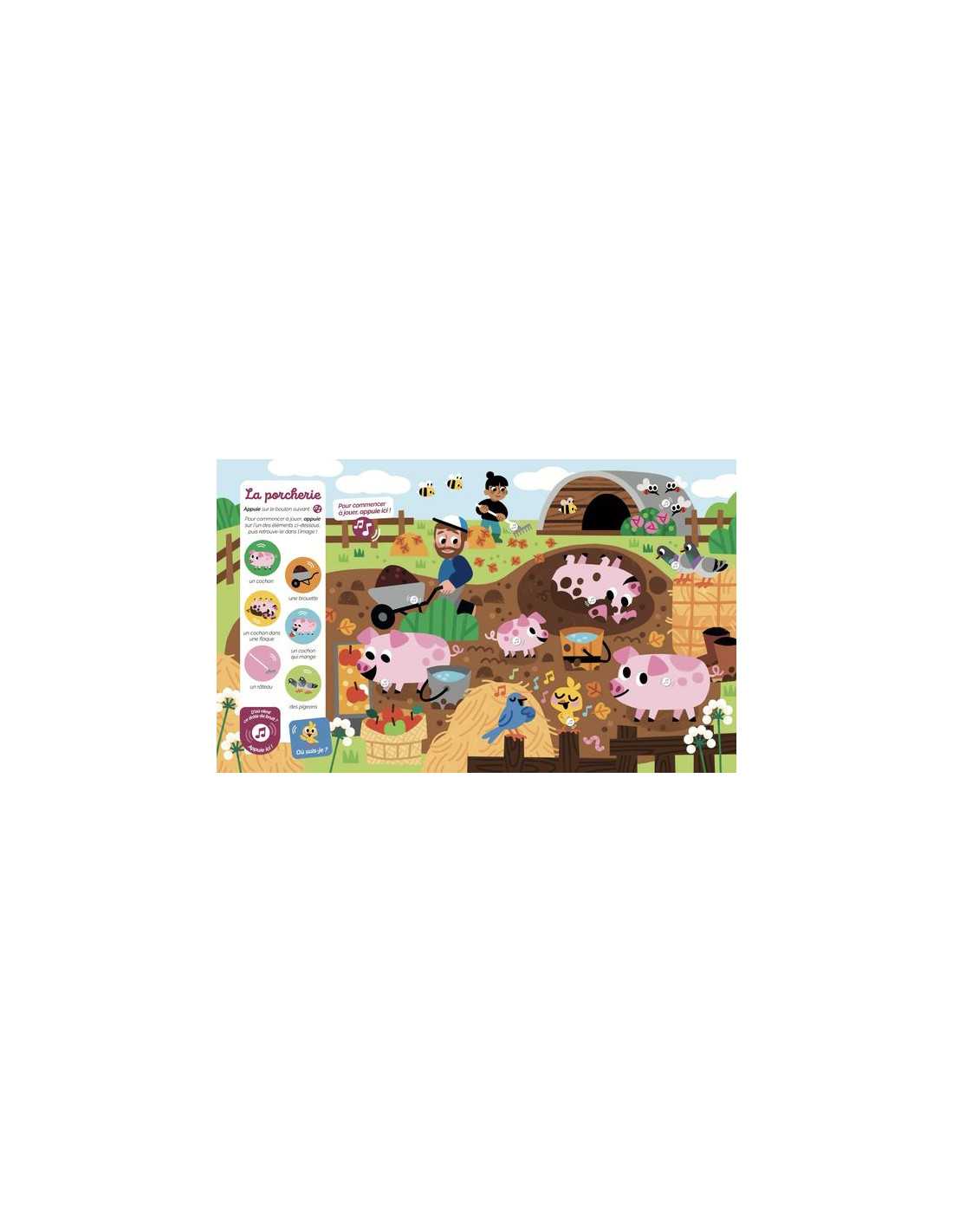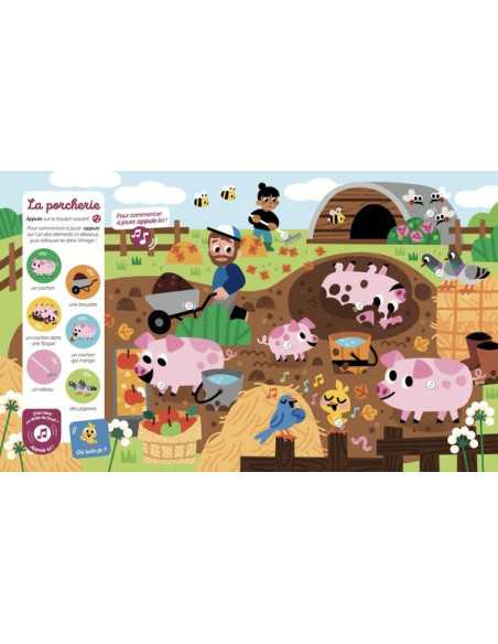 Sur chaque double-page, il observe et écoute attentivement pour retrouver 6 éléments et une mascotte qui se cache dans tous les univers de la ferme. Sur chaque planche, un mode de jeu aléatoire est disponible : en appuyant sur la puce, on entend des cris d'animaux et bruitages à retrouver dans l'illustration. On y retrouve les sons de la liste, mais aussi 2 sons mystères.
