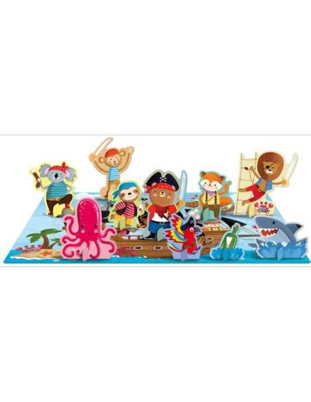 De grandes aventures t’attendent avec les pirates! Feuilletez le livret, construisez le puzzle et apprenez à reconnaître les différents éléments du monde des pirates. Embelli de détails irisés, ce coffret contient un livre de 10 pages, un puzzle de 40 pièces et 10 figurines prédécoupées à assembler et à placer sur le puzzle.