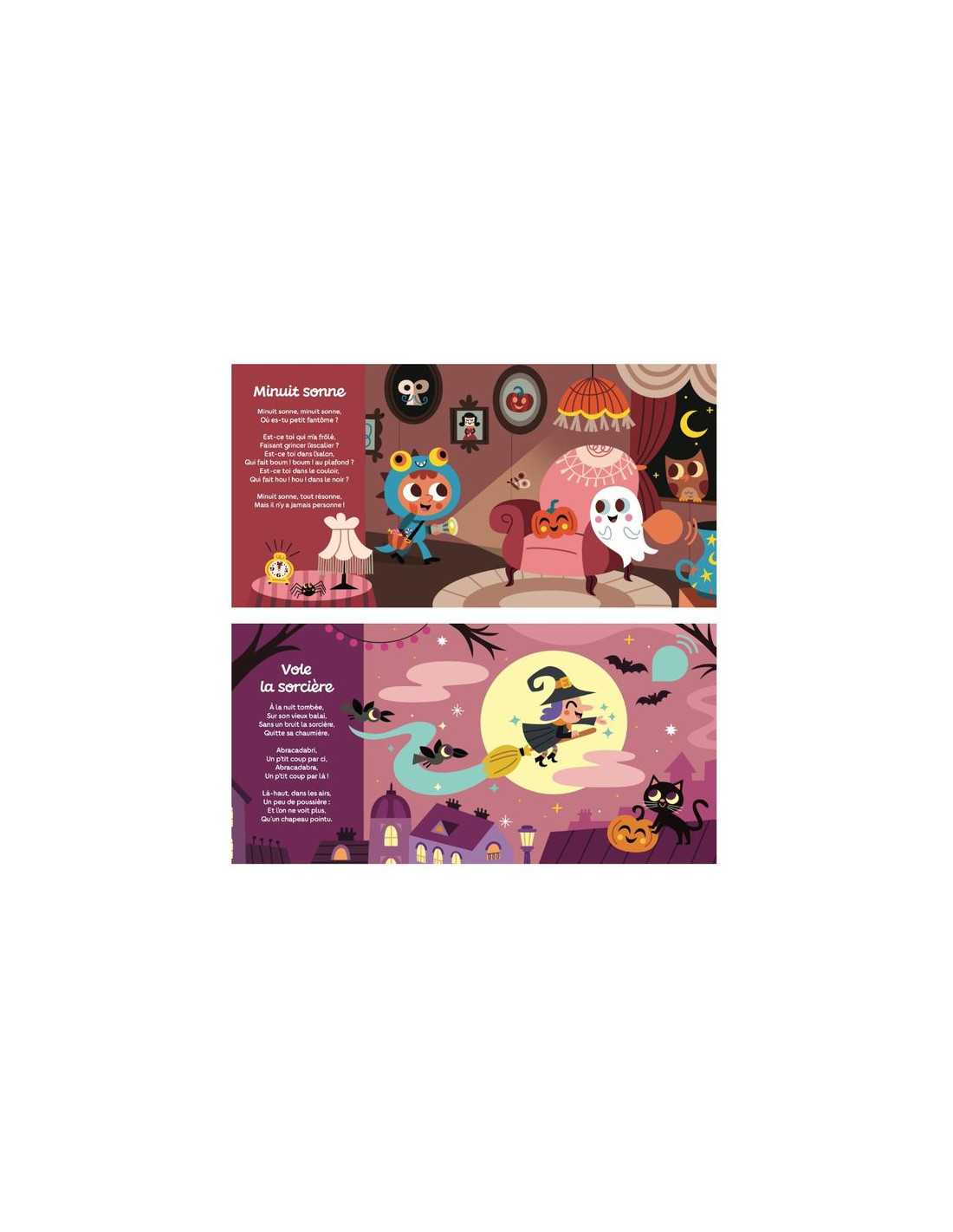 Un livre sonore pour plonger dans l’univers d’Halloween à travers des comptines connues et inventées : Minuit sonne, Peur d’une petite bête, Promenons-nous dans les bois, Vole la sorcière, L’araignée gypse, Le bonbon.