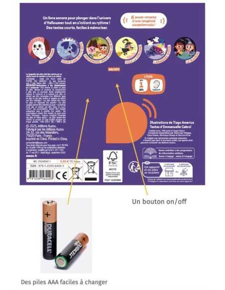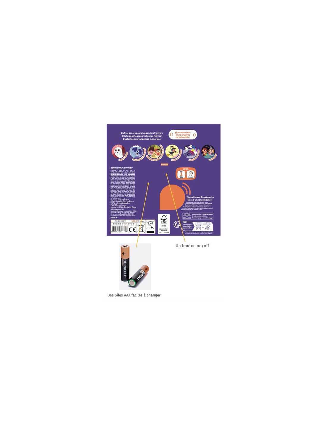 Le livre contient un bouton on/off (pour durer plus longtemps) et des piles AAA (faciles à changer).
