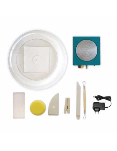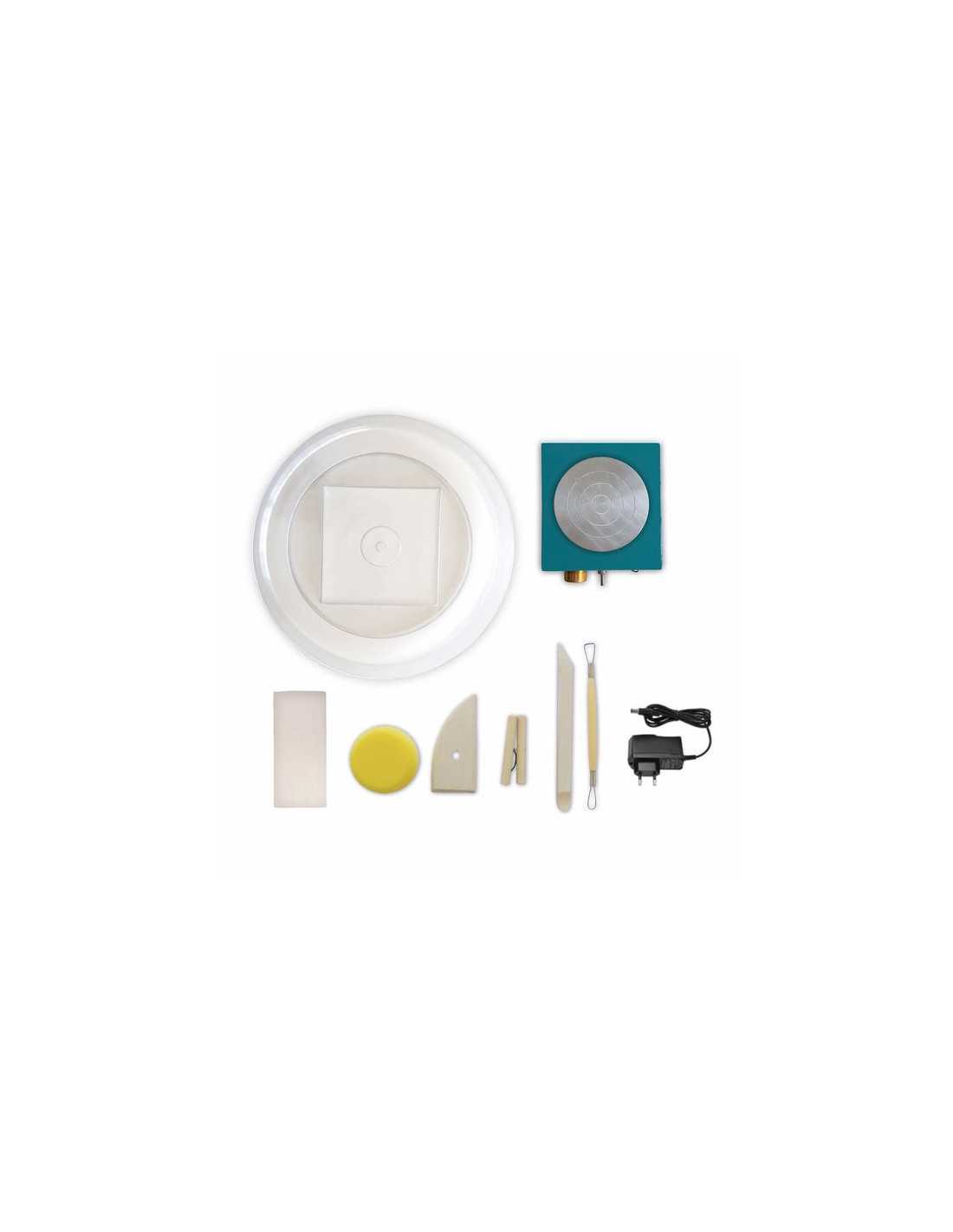 Un véritable tour de potier, compact, facile à ranger avec 1 plateau en aluminium (10,5 cm), 1 interrupteur avant / arrière, 1 bouton pour varier la vitesse (jusqu’à 1000 tr/min), 1 cordon d’alimentation + prise, 5 outils de poterie en bois idéal pour la sculpture, le modelage, la découpe, le burinage, le lissage et plus encore, un bloc d’argile, 1 bac de protection et 1 livret avec modèles et instructions.