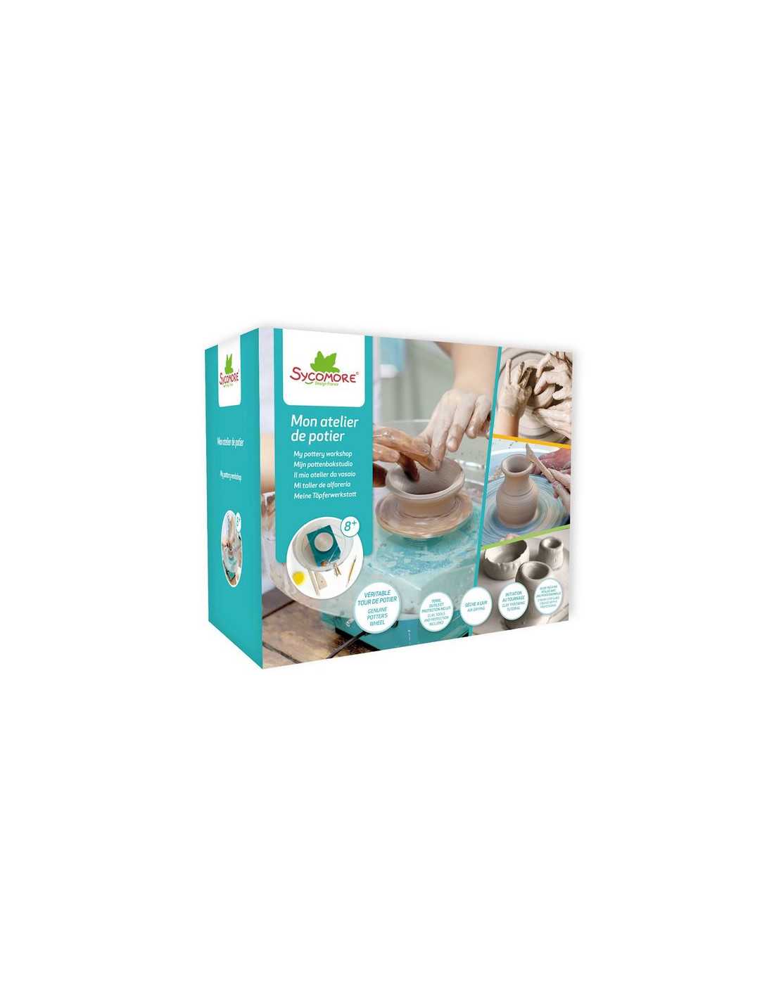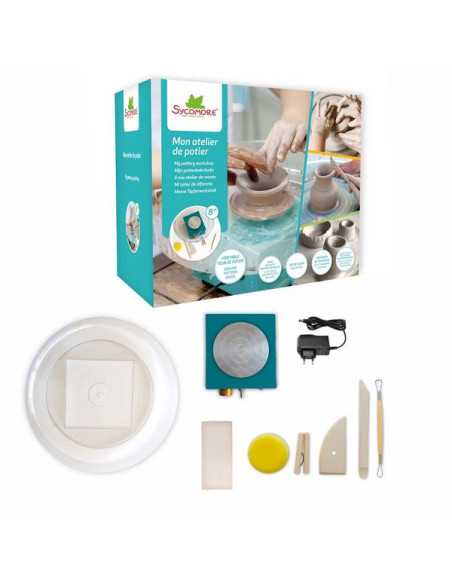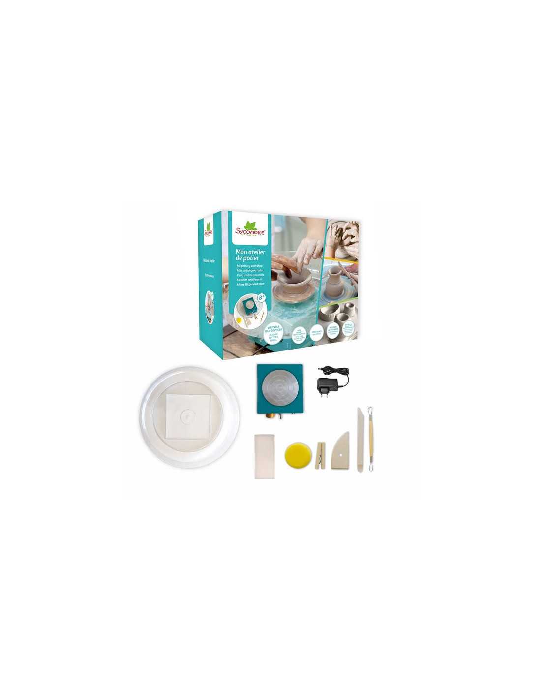 Découvrez le coffret Atelier de poterie de Sycomore, un coffret de loisirs créatifs pour les enfants à partir de 8 ans avec un véritable tour de potier compact et facile à ranger avec 1 plateau en aluminium.