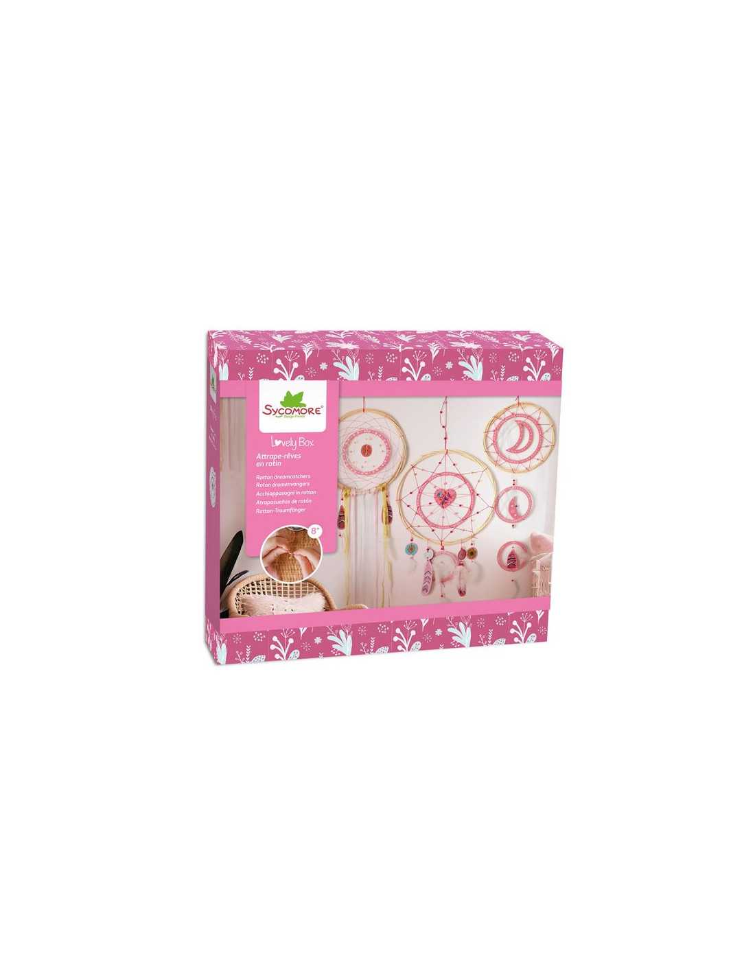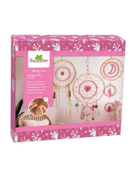 Découvrez le coffret Attrape rêves en rotin de Sycomore, un coffret de loisirs créatifs de la collection Lovely Box pour les enfants à partir de 8 ans qui vont réaliser 3 attrape-rêves géants en rotin.