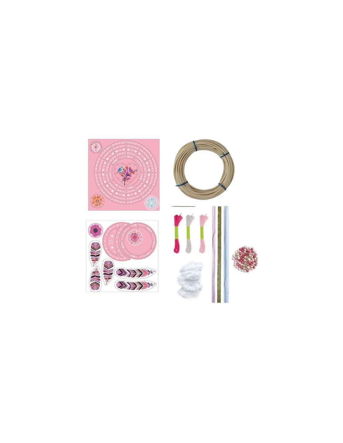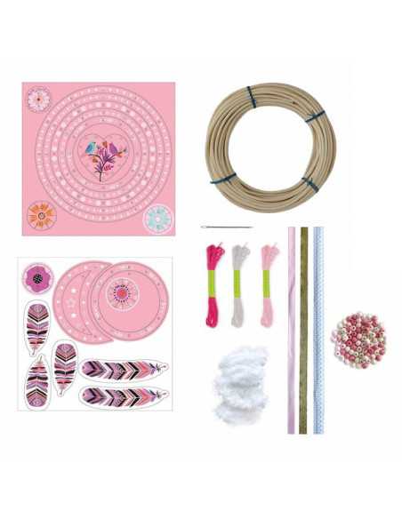 Ce coffret contient 2 planches imprimées pré-découpées, 3 longueurs de rotin, 1 aiguille, ficelle, plumes, 3 fils de coton (3 coloris), rubans (2 coloris), dentelle, perles bois (4 coloris) et 1 livret d’instructions.
