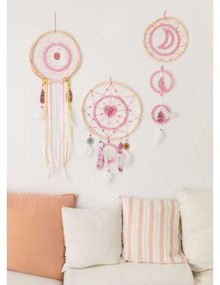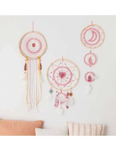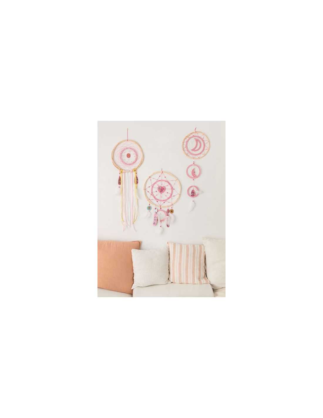 Plongez dans un univers bohème et créatif avec cette superbe boîte qui contient tout le nécessaire pour réaliser 3 attrape-rêves géants en rotin.