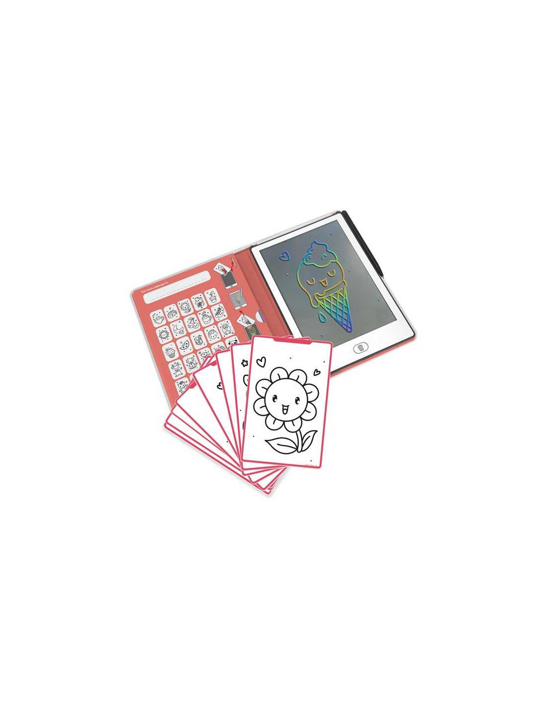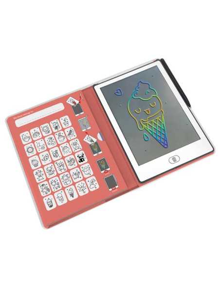 Le coffret comprend une tablette avec 30 dessins à décalquer avec un écran LCD de 8,2" (Liquid Crystal Display), un bouton verrou pour sauver le dessin, un bouton pour effacer et un stylo.