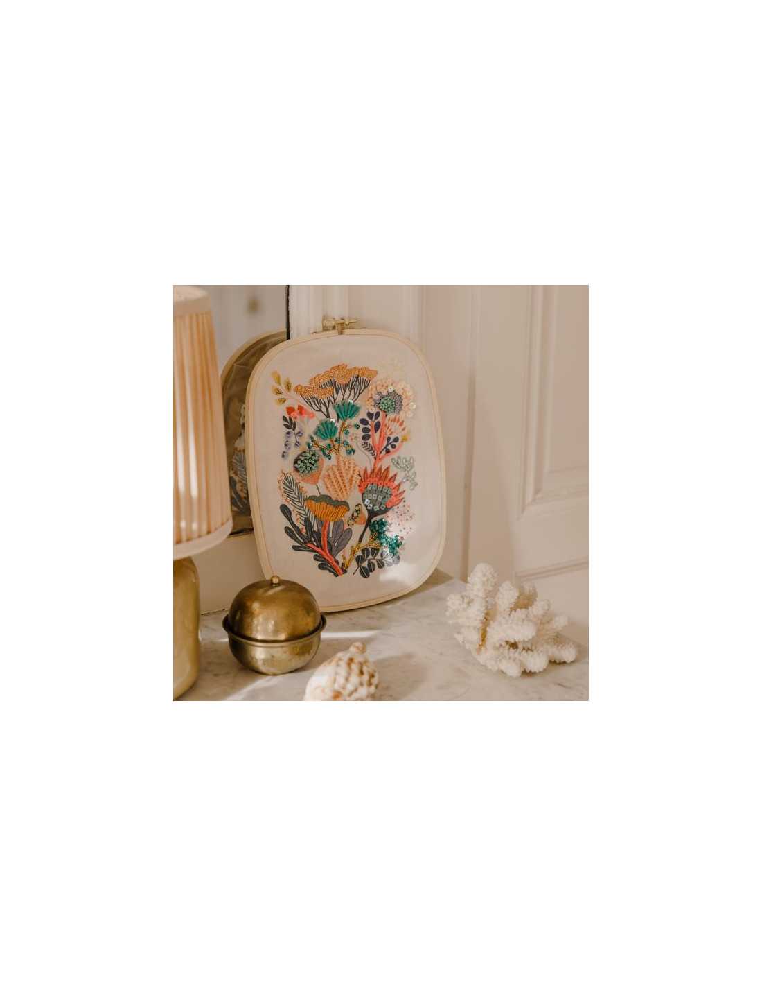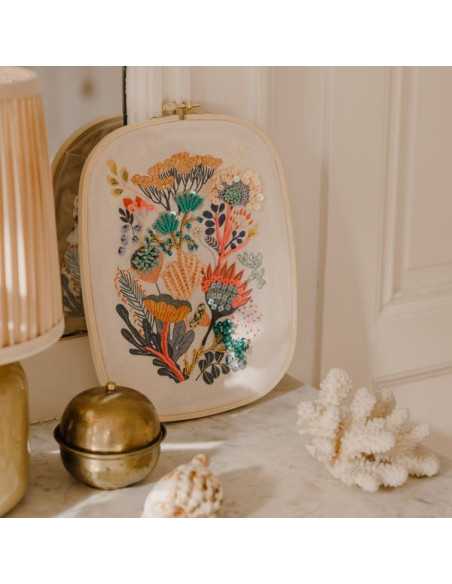 Ce coffret comprend 1 tambour de broderie en bois, 1 toile imprimée, 1 paire de ciseaux de broderie, 13 boîtes de perles et sequins, 1 tapis d'enfilage, 2 aiguilles, 1 passe-fil, 2 bobines de fil doré, 1 modèle à suivre, un dépliant et une carte avec QR code menant à une vidéo tuto pour découvrir l’activité.