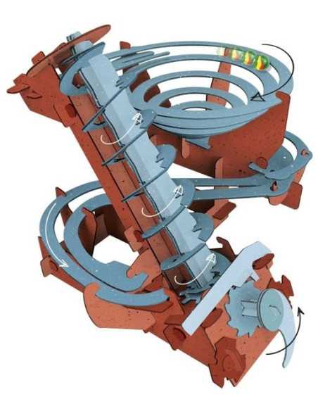 Une bille qui roule sur le sol s’arrête tôt ou tard : à un certain moment intervient une force de friction qui les empêche d’effectuer ce qu’on appelle le "mouvement perpétuel". La recherche d’un mouvement qui ne s’arrête jamais a toujours fasciné les scientifiques et les inventeurs, dont Léonard de Vinci. Pour Léonard, la recherche de cette chimère représentait une opportunité unique d’imaginer l’impossible, et c’est précisément à partir de là que l’on peut commencer à construire la maquette, librement inspirée d’un ensemble de différentes machines conçues par un autre grand inventeur : Archimède de Syracuse.