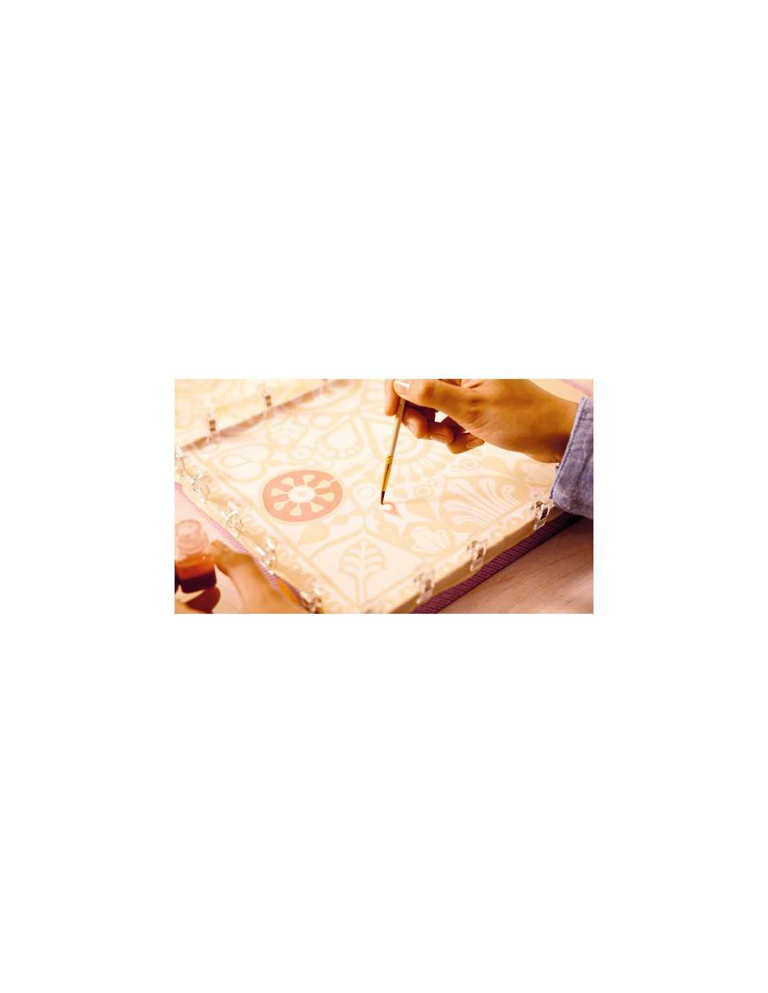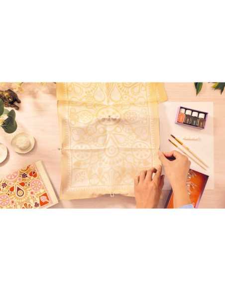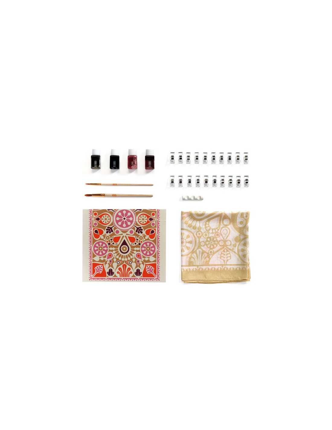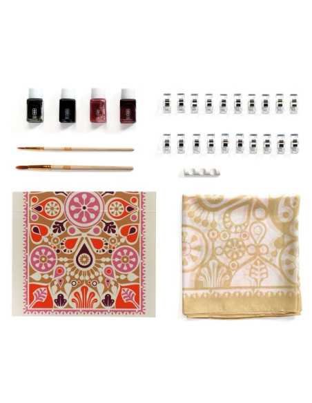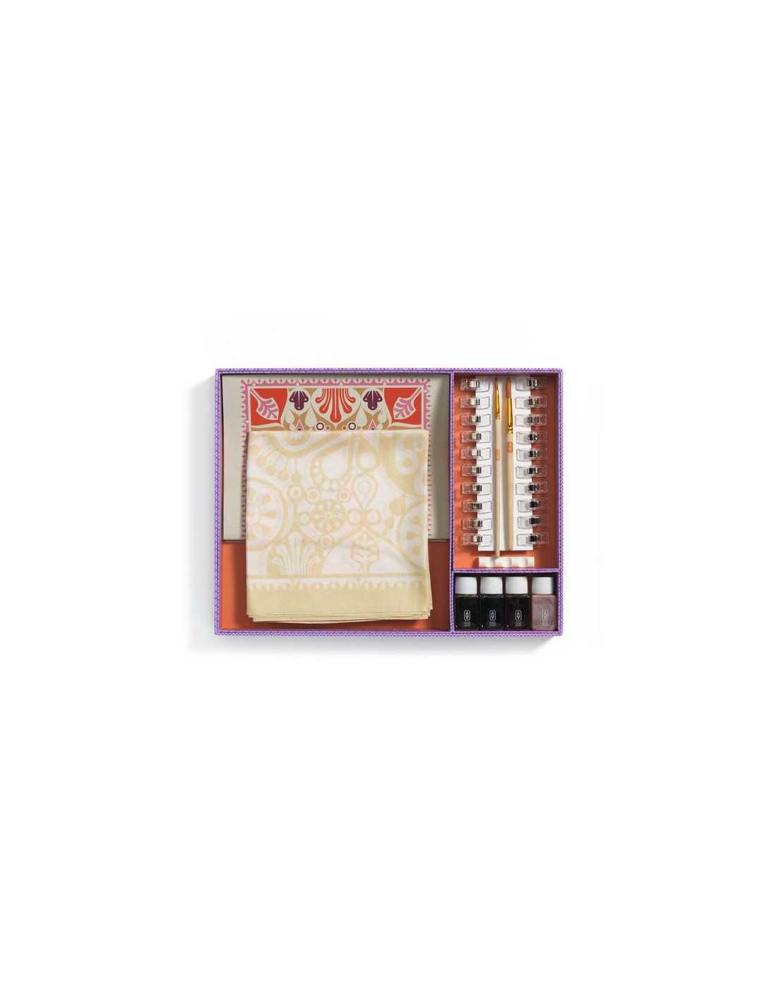 Ce coffret comprend 1 foulard en soie (dimension 130 x 34 cm ) prêt à peindre, avec la "gutta" déjà posée pour délimiter les motifs, 20 pinces à tissu, 4 bouteilles x 30 ml de peinture sur soie, 2 pinceaux, 1 support pour pinceau, 1 modèle à suivre, un dépliant et une carte avec QR code menant à une vidéo tuto pour découvrir l’activité.
