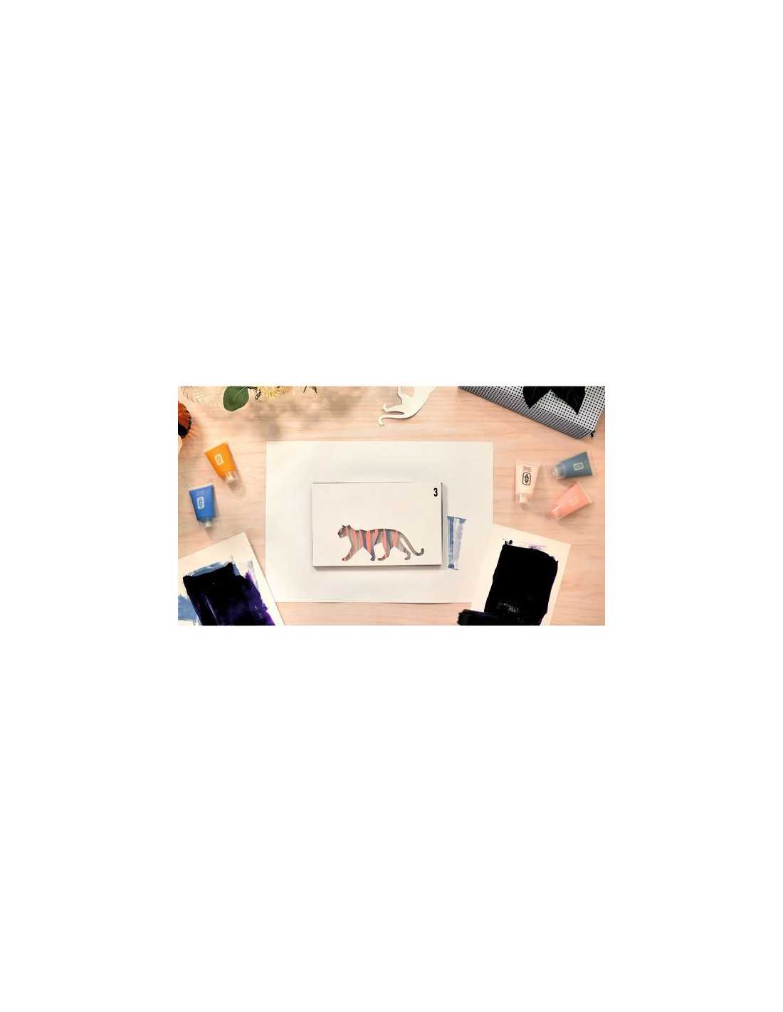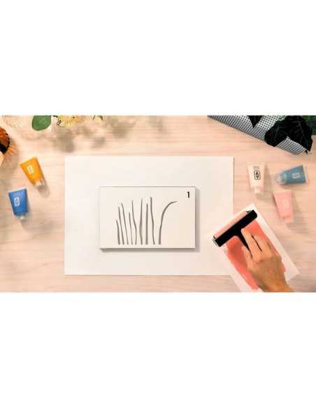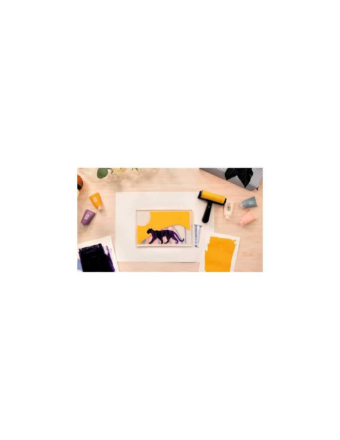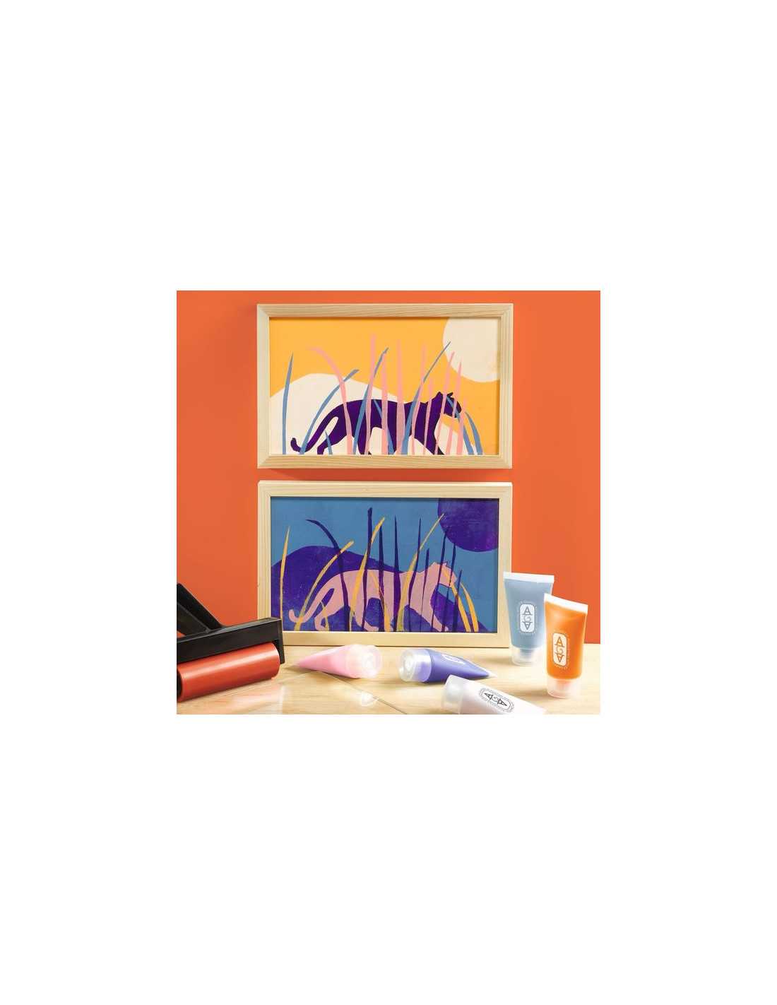 Ce coffret comprend 1 plaque de gel en silicone (format 235 x 150 mm), un rouleau brayer, 5 tubes de peinture 30 ml, 10 papiers à imprimer, 4 pochoirs indéchirables, 2 cadres en bois, un dépliant et une carte avec QR code menant à une vidéo tuto pour découvrir l’activité.
